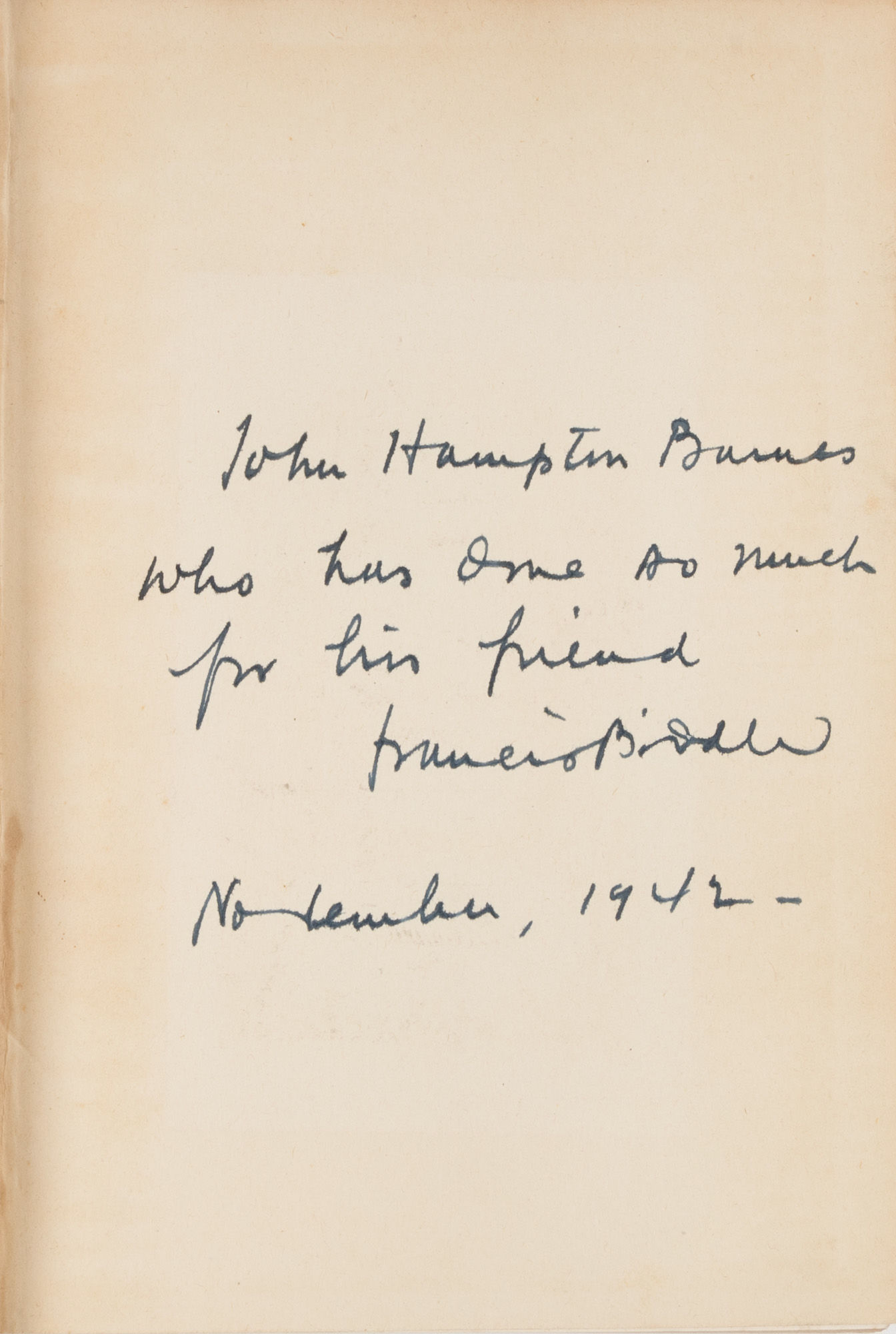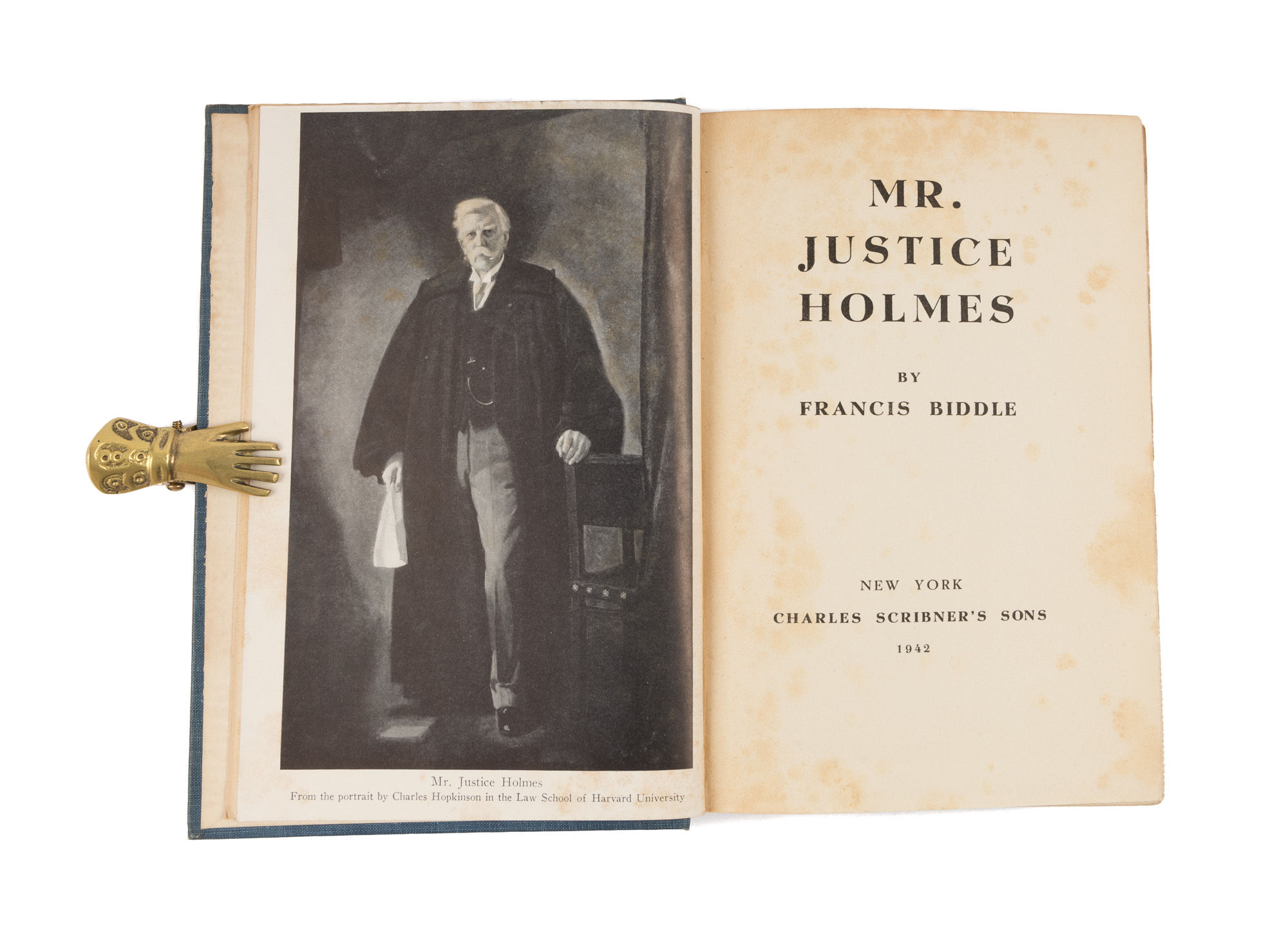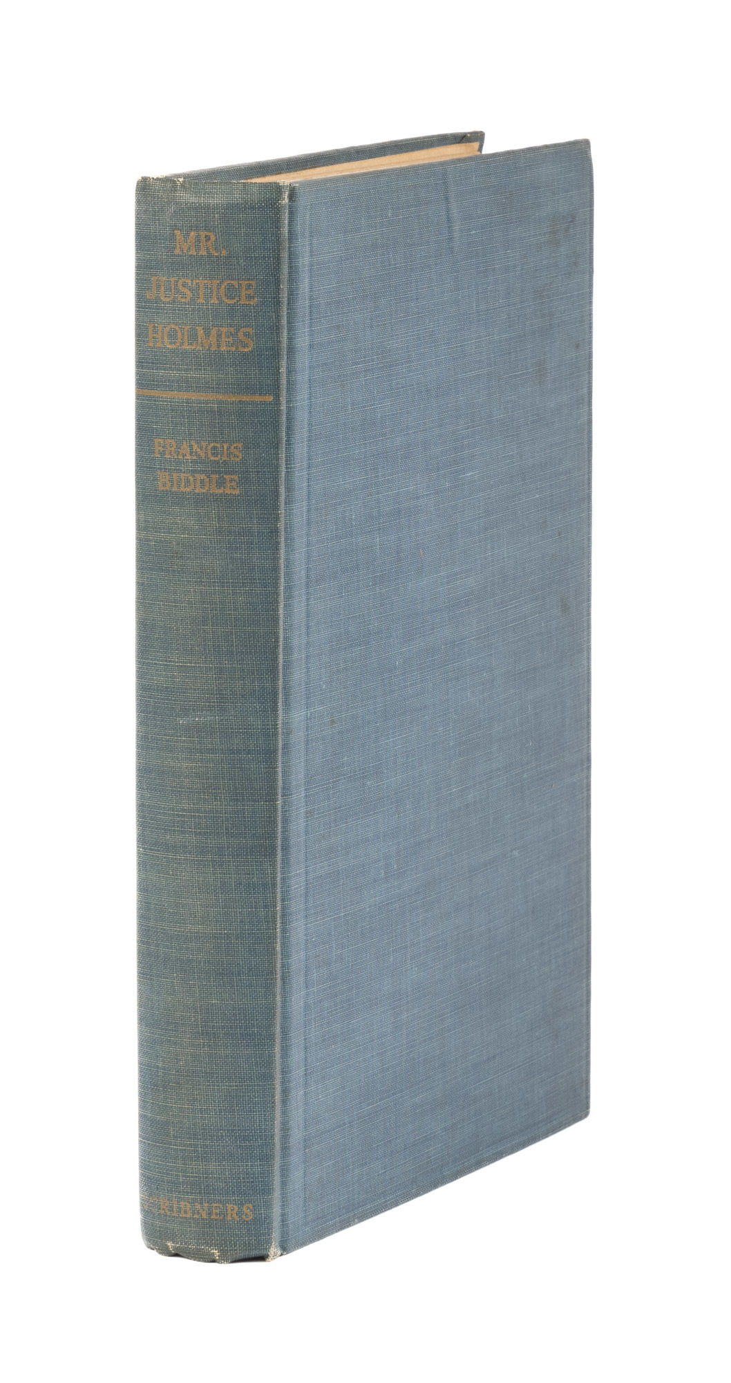 1942. Biddle, Francis. Mr. Justice Holmes. New York: Charles Scribner's Sons, [1942]. [vi], 214 pp. Illustrations. Original cloth, moderate shelfwear, light soiling to exterior, spine slightly darkened. Author inscription "John Hampton Barnes/ Who has done so much/ for his friend/ Francis Biddle/ November, 1942" to front free endpaper, bookplate of John Hampton Barnes to front pastedown. $85. * Barnes [1860-1952] was chancellor of the Philadelphia Bar Association and helped to draft the 1919 Philadelphia City Charter.