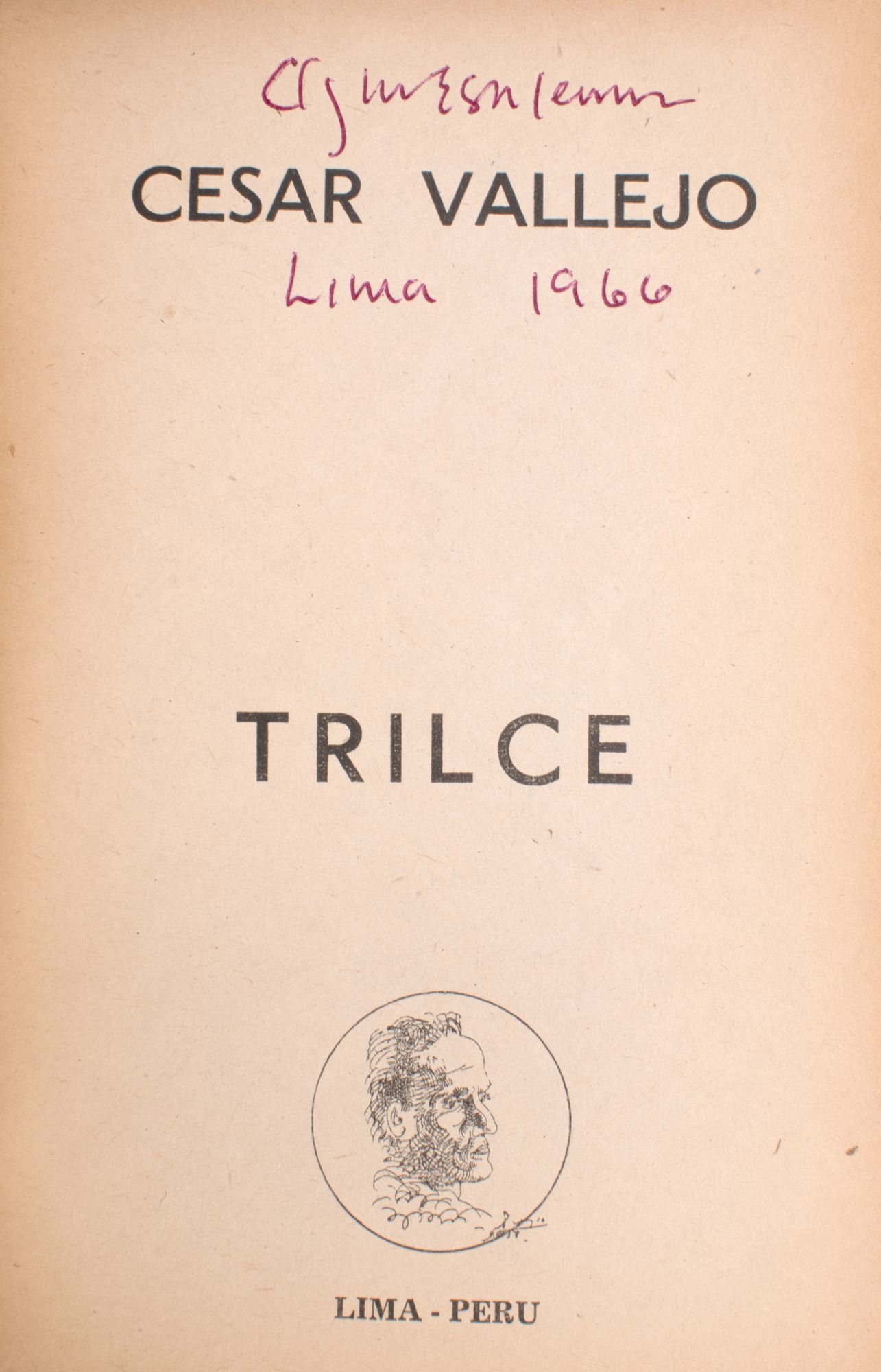 Lima: Editora Peru Nuevo, 1960. Later edition. 123 pp. 12mo. Printed wrappers toned, text toned, fine. Later edition. 123 pp. 12mo. With prologue by José Bergamín and a salutation by Gerardo Diego, first published in the second edition (Madrid, Compañía Ibero-Americana de Publicaciones, 1930). Clayton Eshleman's copy with his ownership signature, dated 1966 in Lima on the title page. Eshleman (1935-2021), poet, translator, and editor, was an important figure for decades in the world of postmodern poetry. He won the National Book Award for his translations of the Peruvian modernist Cesar Vallejo. He discovered Vallejo's work in 1958, and started translating the Poemas Humanos in 1962, moving to Lima to live and work on his translations from 1964-1968.