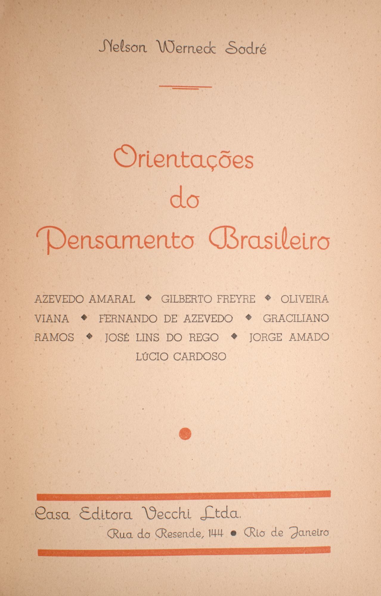 Rio de Janeiro: Casa Editora Vecchi Ltda, 1942. First edition. 190. Rubbing along the spine, some loss to head and foot, closed tear, crease to cover of self-wraps, unopened. First edition. 190. With sections covering the important modern Brazilian writers Azevedo Amaral, Gilberto Freyre, Oliveira Viana, Fernando de Azevedo, Graciliano Ramos, José Lins do Rego, Jorge Amado, and Lúcio Cardoso.