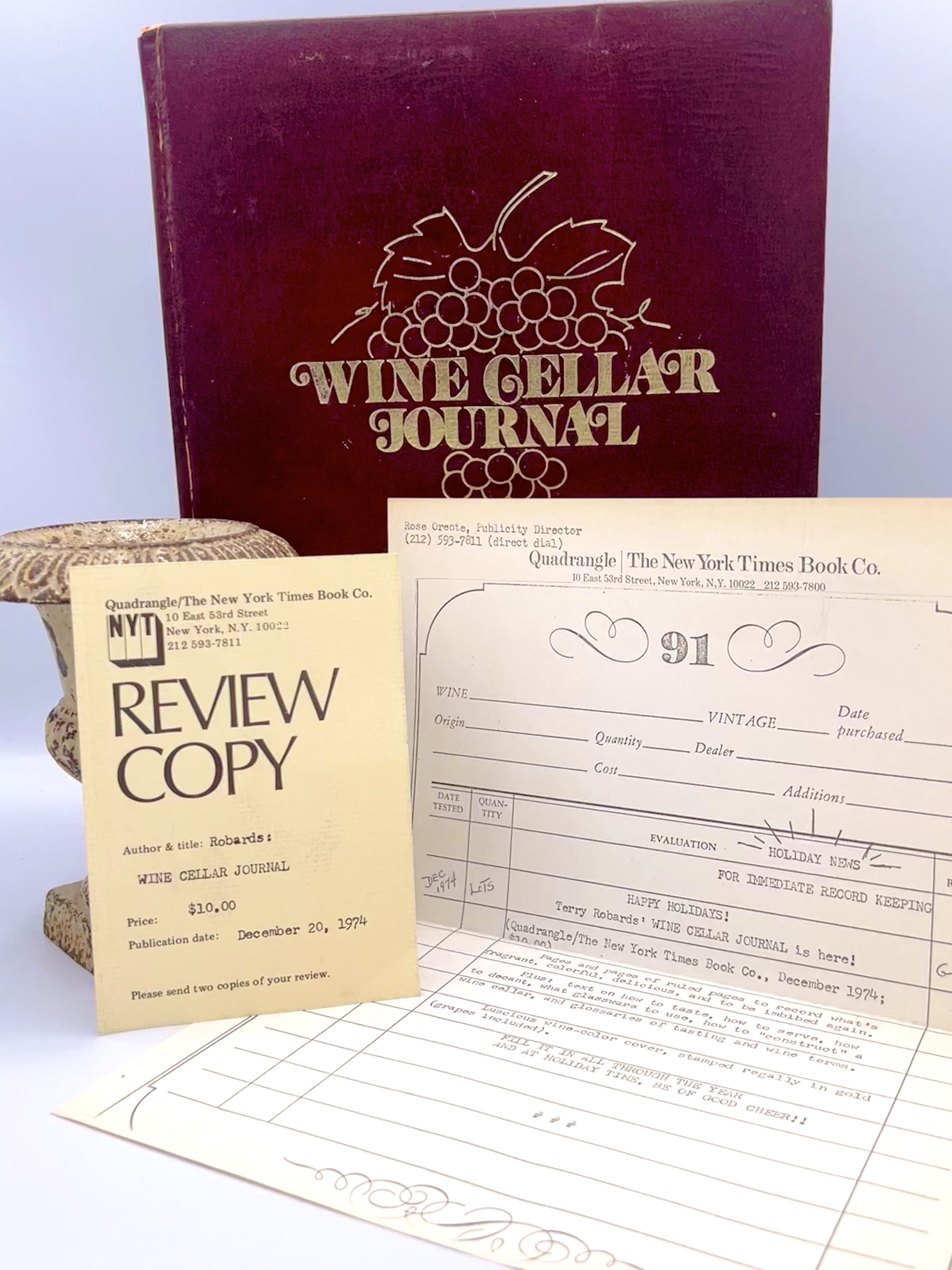 New York: Quadrangle/The New York Times Book Co., 1974. Hardcover. Red boards, gilt title and decoration. 120 pages [40 pages for notes] 28 x 21 cm. Blank. At the start of the US wine craze, The New York Times introduced this Journal for those brave enough to start their very own wine collection. Complete with pages upon pages to record the fragrance, color, taste of every bottle that passes through the dining room. Review Copy with printed letter of introduction. Front board cracked with splitting to bottom cover.