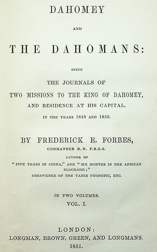 A Royal Naval officer's journals of visits to Dahomey (a kingdom located in what is now southern Benin), published with an antislavery intent: "It is the object of the author...to illustrate the dreadful slave hunts and ravages, the annihiliations and exterminations, consequent on this trade; and to bring prominently before the British public the sacred service they are rendering" through their efforts to halt the slave trade (p.iv, vol.I). NOT IN ABBEY.