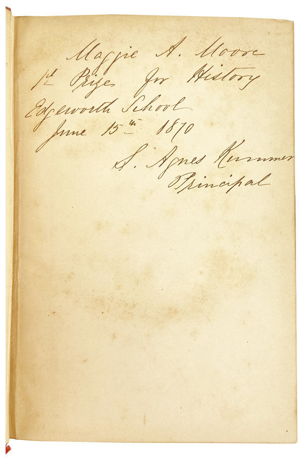 New York: Charles Scribner and Company, 1870. Good+. New York: Charles Scribner and Company, 1870. First American Edition. Small octavo; publisher's red cloth, gilt-lettered spine; 296,10pp.; frontispiece, illus. throughout, many full-paged. Rather extensive biopredation along joints, cloth rather toned and soiled, contemporary manuscript prize inscription on front free endpaper addressed to Maggie A. Moore, "1st Prize for History." Good to Very Good overall.