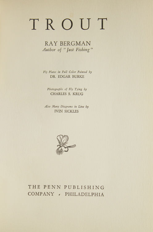 Philadelphia: Penn Publishing Company, 1938. First trade edition. With fly plates in color by Dr. Edgar Burke, photographs and diagrams by Charles S. Krug and Ivin Sickles. 451 pp. 1 vols. Thick 8vo. Original brown cloth. Fine in rare pictorial clipped dust jacket by Edgar Burke (some wear, overall very good, minor loss at head of spine panel ). Burke, Edgar. First trade edition. With fly plates in color by Dr. Edgar Burke, photographs and diagrams by Charles S. Krug and Ivin Sickles. 451 pp. 1 vols. Thick 8vo. Laid in are 3 glassine leader Envelopes of gut from Ray Bergman. Bruns B-134; Wetzel, p. 104 ("A monumental work on the subject")