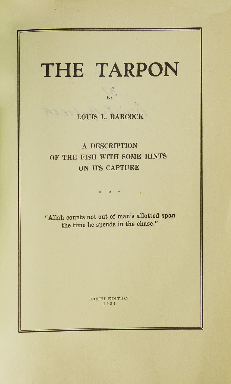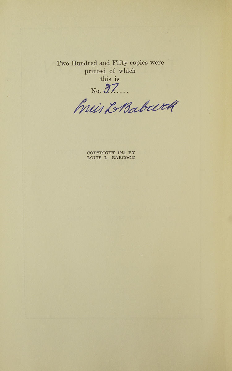[N.p., Buffalo: Privately printed], 1951. Fifth edition. No. 37 of 250 copies, signed by the author. With 1 plate and a few figures in text. 157, ii [index] pp. 1 vols. 8vo. Stiff wrappers, pictorial onlay to upper cover. Spine a bit toned, else fine. Fifth edition. No. 37 of 250 copies, signed by the author. With 1 plate and a few figures in text. 157, ii [index] pp. 1 vols. 8vo. The fifth edition of Babcock’s classic work (first published in 1920). With a nostalgic preface, noting “Fifteen years have passed since the publication of the fourth edition of this book. … I have lost too many fish to assert any claim to infallibility. … I am grateful for the friendships which this little book has created and confirmed. No attempt has been made to interest the general reader. …”. Bruns B5; Callahan iv
