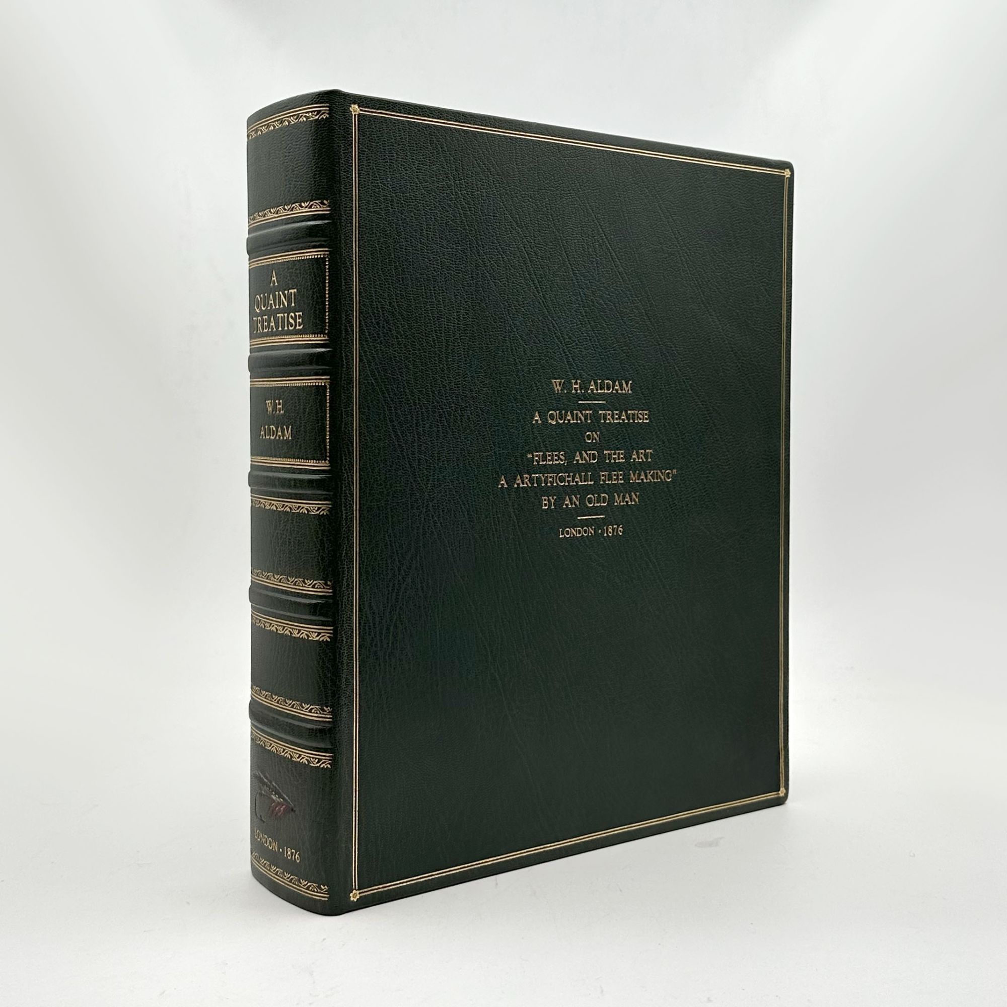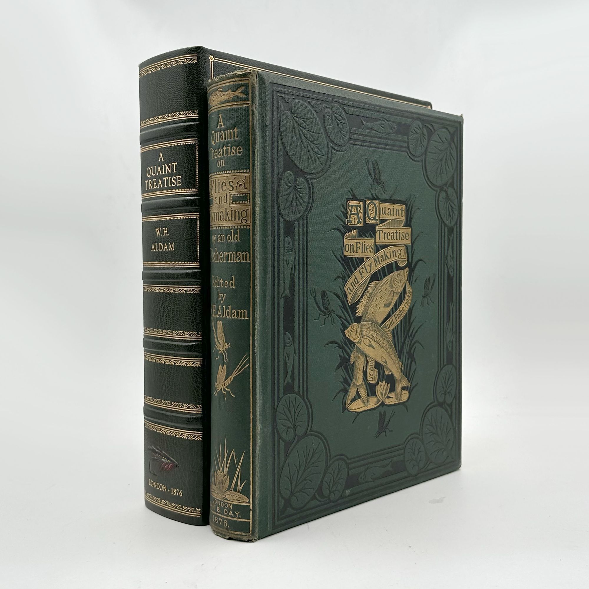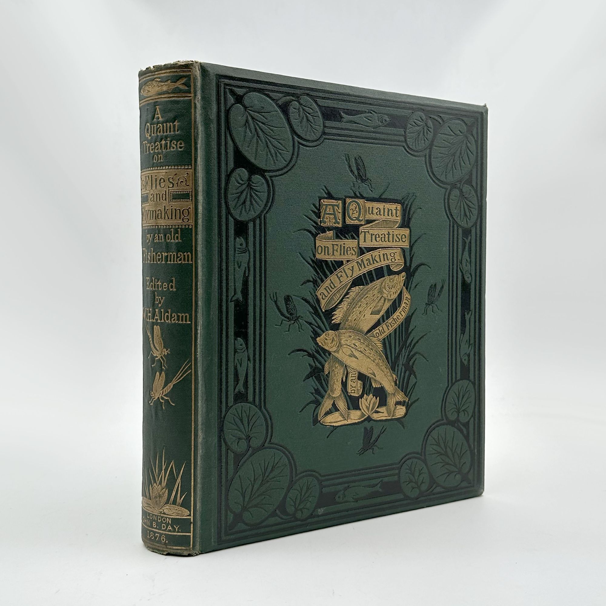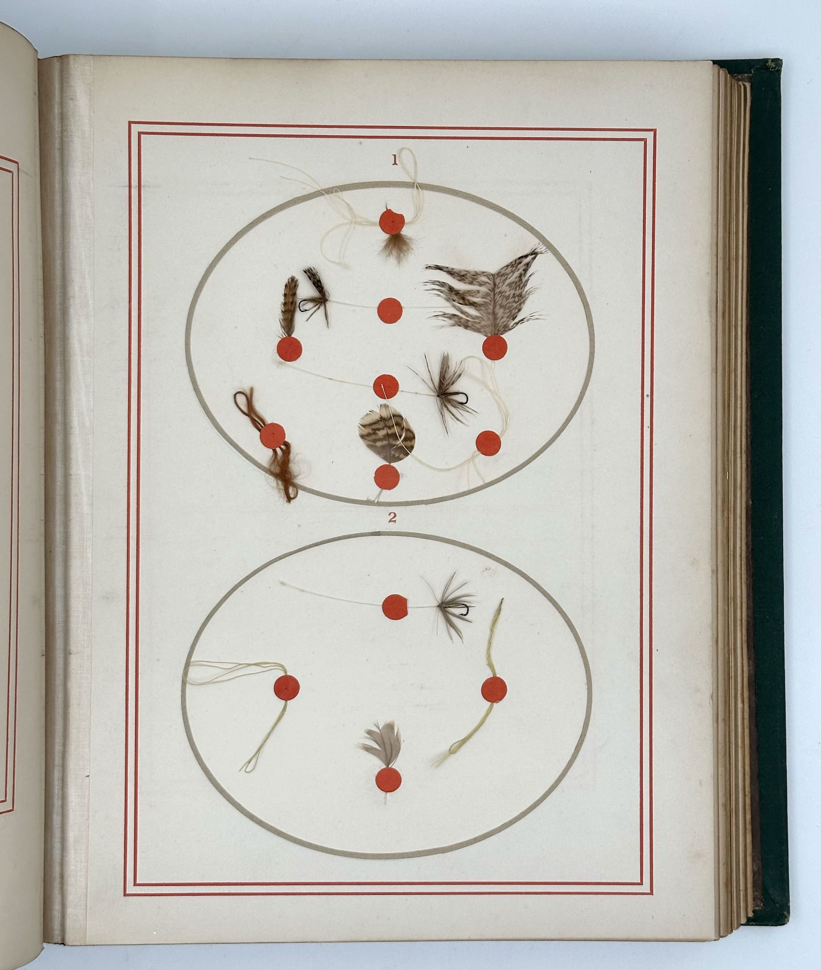 London: John B. Day, 1876. First edition, second issue. Two chromolithograph plates after James Poole, 2 completed flies and 23 flies with dressing materials displayed in 22 sunken mounts on six leaves. Title page printed in red and black, title and text printed within double red rules. xiii, [xiv, blank], [xv, errata], 91 pp. 1 vols. 4to. Original green cloth, upper cover with elaborate gilt and blind design and title, a.e.g. Bookplate of Edward Sands Litchfield. Faintest rubbing at head of spine, title page faintly foxed, pencil checks on contents page, else an exceptionally clean, fine copy. Custom full green morocco folding box with hand painted fly on spine panel. First edition, second issue. Two chromolithograph plates after James Poole, 2 completed flies and 23 flies with dressing materials displayed in 22 sunken mounts on six leaves. Title page printed in red and black, title and text printed within double red rules. xiii, [xiv, blank], [xv, errata], 91 pp. 1 vols. 4to. The manuscript upon which Aldam based his text appeared at auction in 1999; the author's name was revealed to be Robert Whitehead, but nothing further of the author is known. Both issues of this scarce work bear the date 1876 on the spine; a very few are recorded with a title page date of 1875, but it appears that no copies were actually sold until the Spring of 1876. Approximately 200 copies were sold over a period of several years.