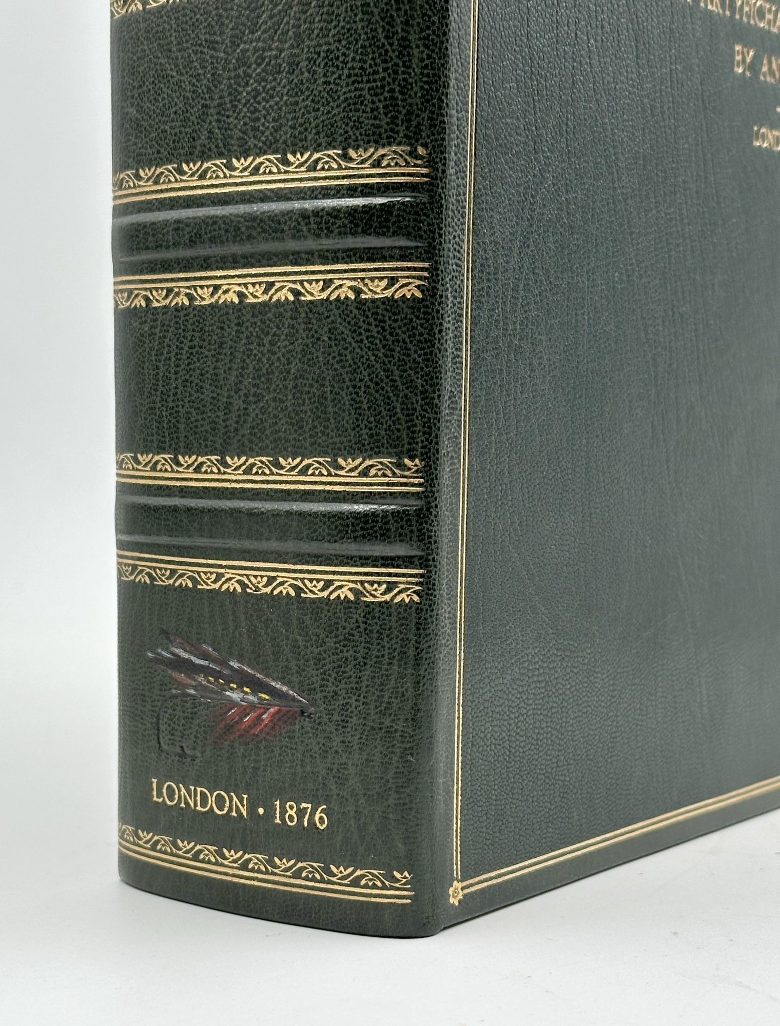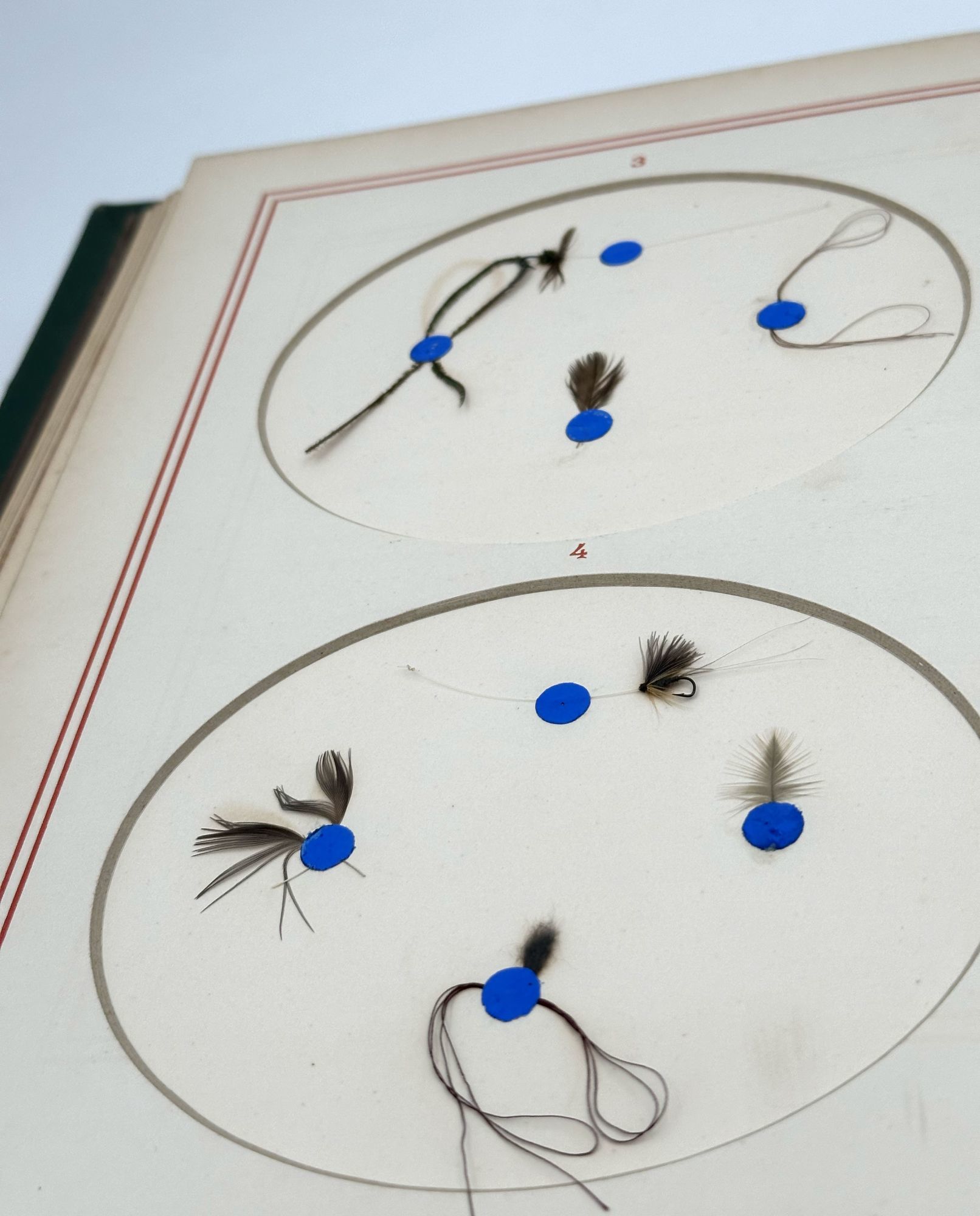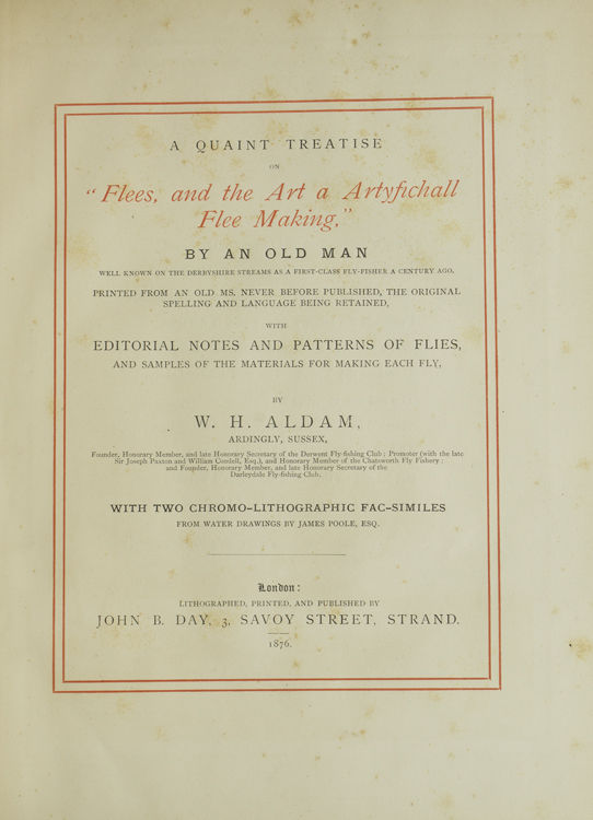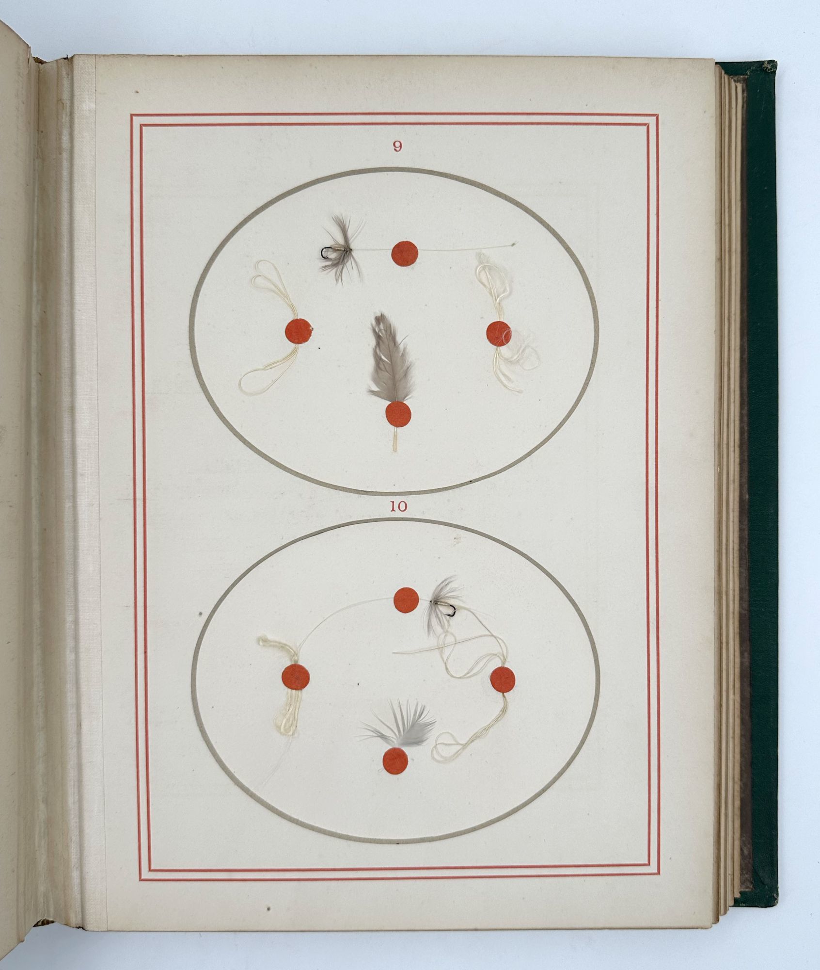 London: John B. Day, 1876. First edition, second issue. Two chromolithograph plates after James Poole, 2 completed flies and 23 flies with dressing materials displayed in 22 sunken mounts on six leaves. Title page printed in red and black, title and text printed within double red rules. xiii, [xiv, blank], [xv, errata], 91 pp. 1 vols. 4to. Original green cloth, upper cover with elaborate gilt and blind design and title, a.e.g. Bookplate of Edward Sands Litchfield. Faintest rubbing at head of spine, title page faintly foxed, pencil checks on contents page, else an exceptionally clean, fine copy. Custom full green morocco folding box with hand painted fly on spine panel. First edition, second issue. Two chromolithograph plates after James Poole, 2 completed flies and 23 flies with dressing materials displayed in 22 sunken mounts on six leaves. Title page printed in red and black, title and text printed within double red rules. xiii, [xiv, blank], [xv, errata], 91 pp. 1 vols. 4to. The manuscript upon which Aldam based his text appeared at auction in 1999; the author's name was revealed to be Robert Whitehead, but nothing further of the author is known. Both issues of this scarce work bear the date 1876 on the spine; a very few are recorded with a title page date of 1875, but it appears that no copies were actually sold until the Spring of 1876. Approximately 200 copies were sold over a period of several years.