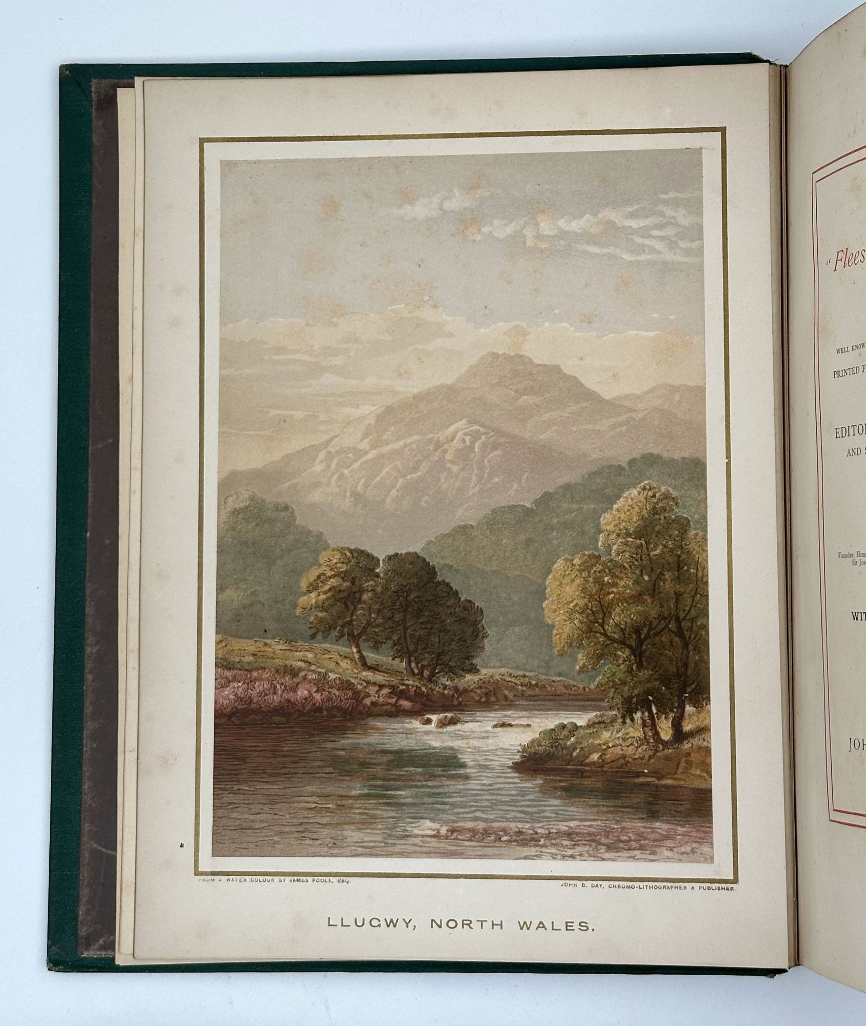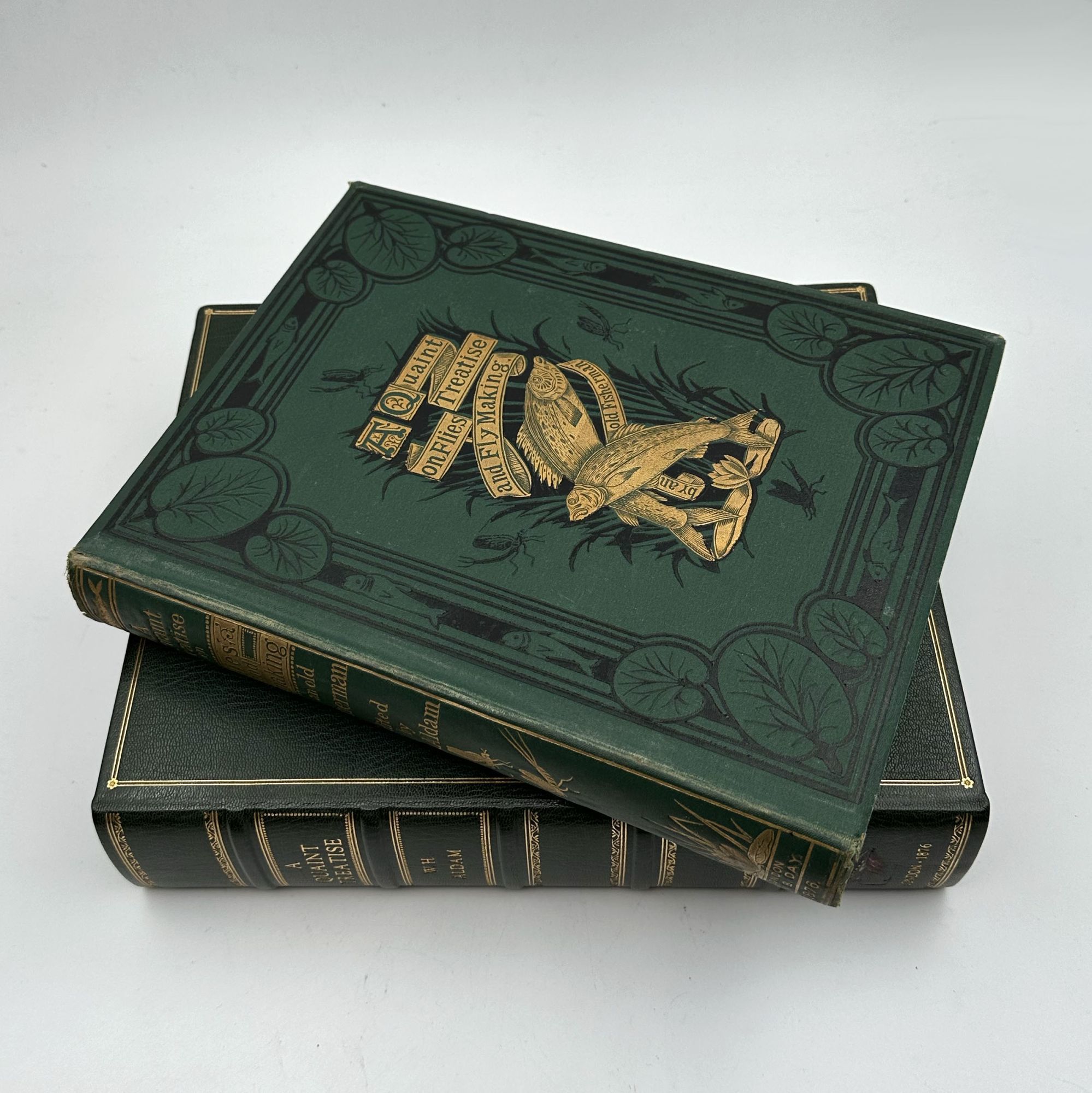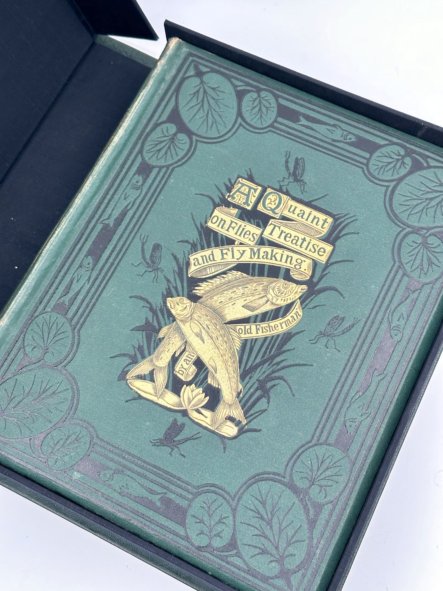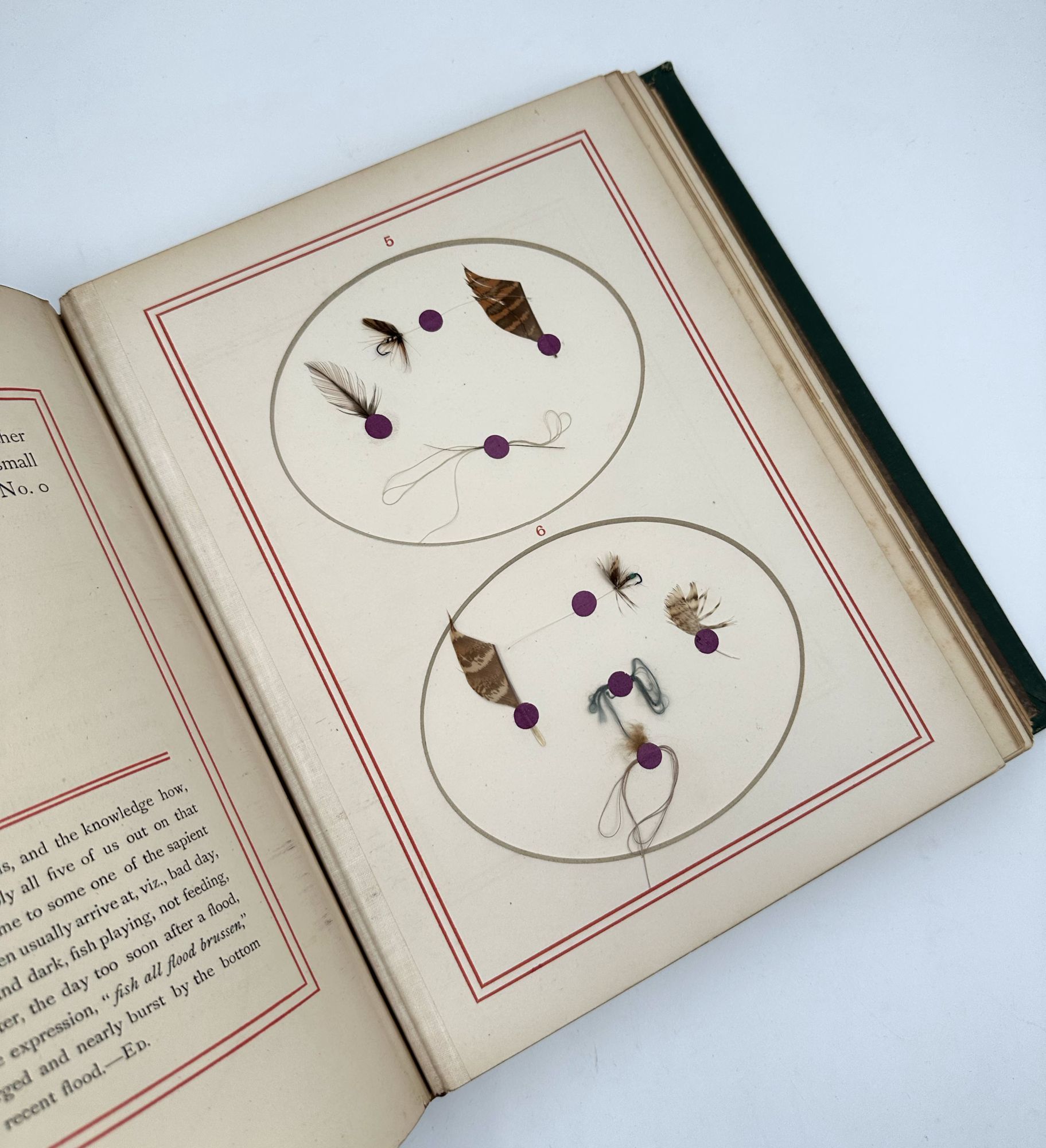 London: John B. Day, 1876. First edition, second issue. Two chromolithograph plates after James Poole, 2 completed flies and 23 flies with dressing materials displayed in 22 sunken mounts on six leaves. Title page printed in red and black, title and text printed within double red rules. xiii, [xiv, blank], [xv, errata], 91 pp. 1 vols. 4to. Original green cloth, upper cover with elaborate gilt and blind design and title, a.e.g. Bookplate of Edward Sands Litchfield. Faintest rubbing at head of spine, title page faintly foxed, pencil checks on contents page, else an exceptionally clean, fine copy. Custom full green morocco folding box with hand painted fly on spine panel. First edition, second issue. Two chromolithograph plates after James Poole, 2 completed flies and 23 flies with dressing materials displayed in 22 sunken mounts on six leaves. Title page printed in red and black, title and text printed within double red rules. xiii, [xiv, blank], [xv, errata], 91 pp. 1 vols. 4to. The manuscript upon which Aldam based his text appeared at auction in 1999; the author's name was revealed to be Robert Whitehead, but nothing further of the author is known. Both issues of this scarce work bear the date 1876 on the spine; a very few are recorded with a title page date of 1875, but it appears that no copies were actually sold until the Spring of 1876. Approximately 200 copies were sold over a period of several years.