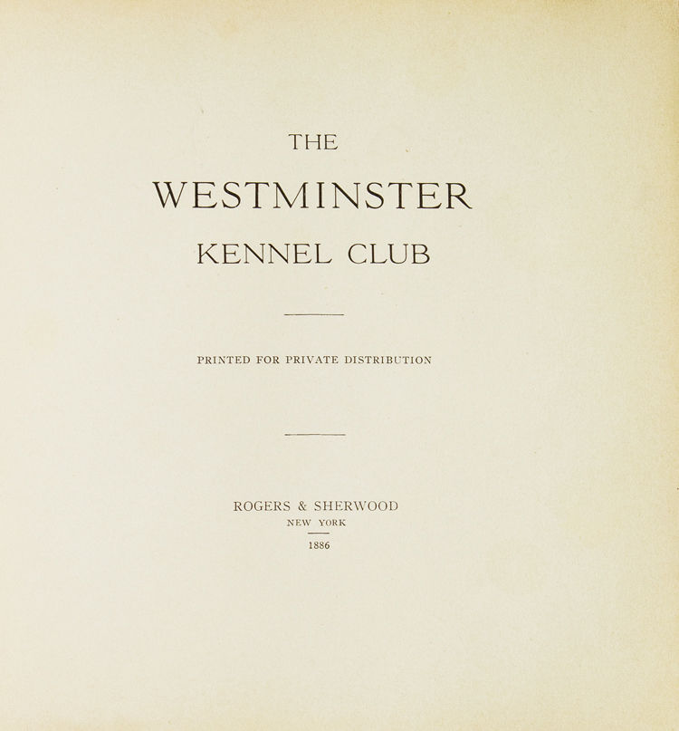 New York: The Derrydale Press, 1929. One of 100 numbered copies, reproducing the original edition of 1886. This copy no. 8, for Mr. David Wagstaff. Illustrated with four plates and a map. 1 vols. 8vo. Pale brown gilt-stamped cloth, decorative endpapers. Front hinge open at first leaf of text, else fine. One of 100 numbered copies, reproducing the original edition of 1886. This copy no. 8, for Mr. David Wagstaff. Illustrated with four plates and a map. 1 vols. 8vo. Connett's fine facsimile of the 1886 year book of the Westminster Kennel Club, established in Babylon, Long Island, in 1877. "An extremely rare and hard-to-get Derrydale" - Frazier