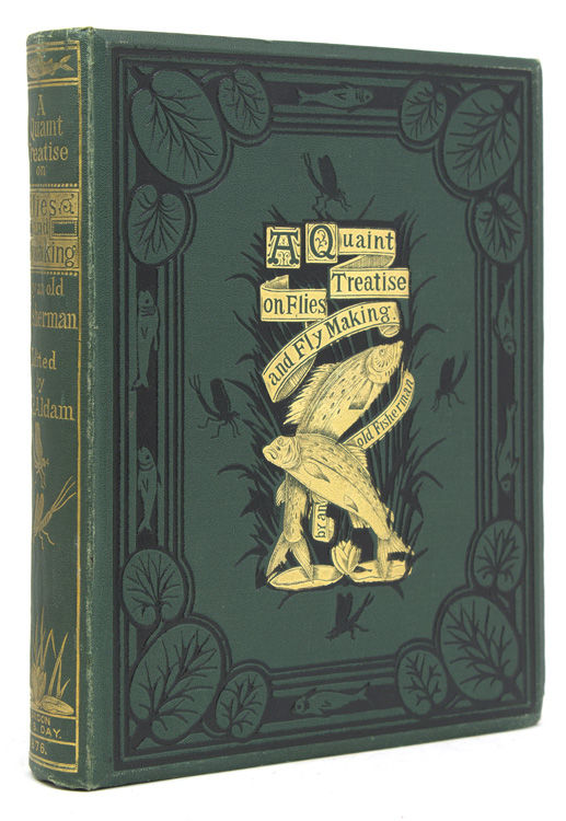 London: John B. Day, 1876. First edition, second Issue (later state or the “Unauthorized Issue” without the 2 chromolithograph plates). 2 completed flies and 23 flies with dressing materials displayed in 22 sunken mounts on six leaves. Title page printed in red and black, title and text printed within double red rules. xiii, [xiv, blank], [xv, errata], 91 pp. 1 vols. 4to. Original green cloth stamped in gilt and black, a.e.g. Some shelf wear, some minor foxing, inner hinge cracked. Very good plus copy. Custom morocco backed box. First edition, second Issue (later state or the “Unauthorized Issue” without the 2 chromolithograph plates). 2 completed flies and 23 flies with dressing materials displayed in 22 sunken mounts on six leaves. Title page printed in red and black, title and text printed within double red rules. xiii, [xiv, blank], [xv, errata], 91 pp. 1 vols. 4to. Issued by Day probably without Aldam's approval (he referred to them as "spurious" copies). Thus with no color plates, and with half-moon white serrated paper seals attaching the flies, which have a different source from that of the copies sold with Aldam’s approval. Heckscher 18; Litchfield 49; Gee 84; Kerridge 79; Westwood & Satchell 3; Flyfisher's Journal, Summer 2000, pp.31-36