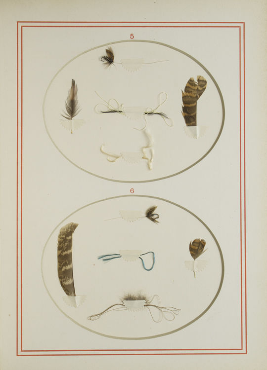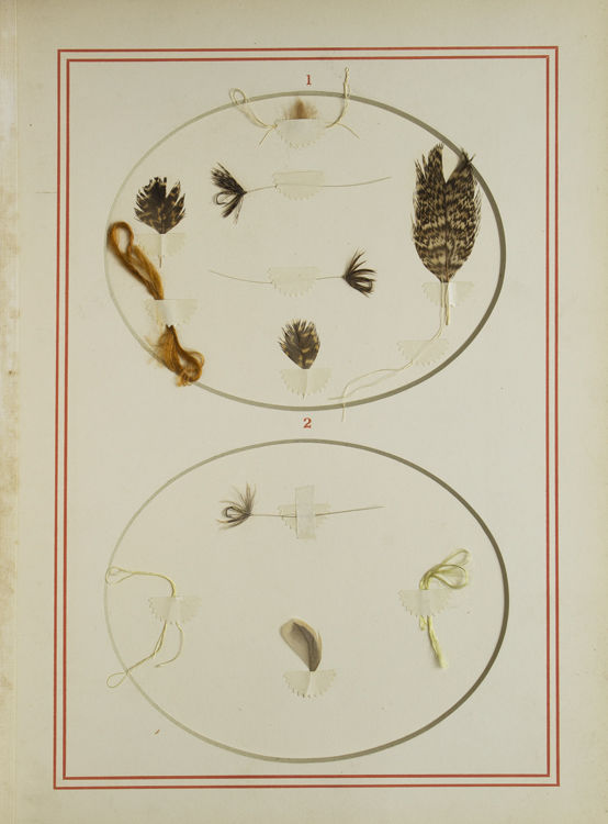 - 2 completed flies and 23 flies with dressing materials displayed in 22 sunken mounts on six leaves. Title page printed in red an
