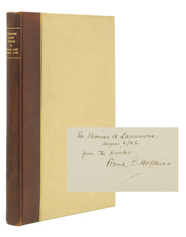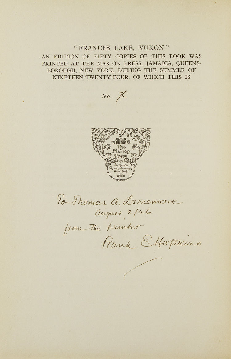 Flushing, Long Island: [Marion Press], 1924. Copy #X of 50 copies. Printed at the Marion Press. Inscribed on the colophon page to Thomas A. Larremore April 2/26 from the printer Frank E. Hopkins. Larremore was the bibliographer of the Marion Press. Illustrated with folding map, folding view, numerous photographic plates and inserted sketch maps. Pp. 103, [1, colophon]. 1 vols. 8vo. Original quarter brown morocco and cloth, titled in gilt. Stamp of Robert Pierce on the front pastedown. Copy #X of 50 copies. Printed at the Marion Press. Inscribed on the colophon page to Thomas A. Larremore April 2/26 from the printer Frank E. Hopkins. Larremore was the bibliographer of the Marion Press. Illustrated with folding map, folding view, numerous photographic plates and inserted sketch maps. Pp. 103, [1, colophon]. 1 vols. 8vo. “A very interesting journal with sketch maps and drawings and photographs. Touches much country not before described and goats are discovered near Frances Lake …” — Phillips