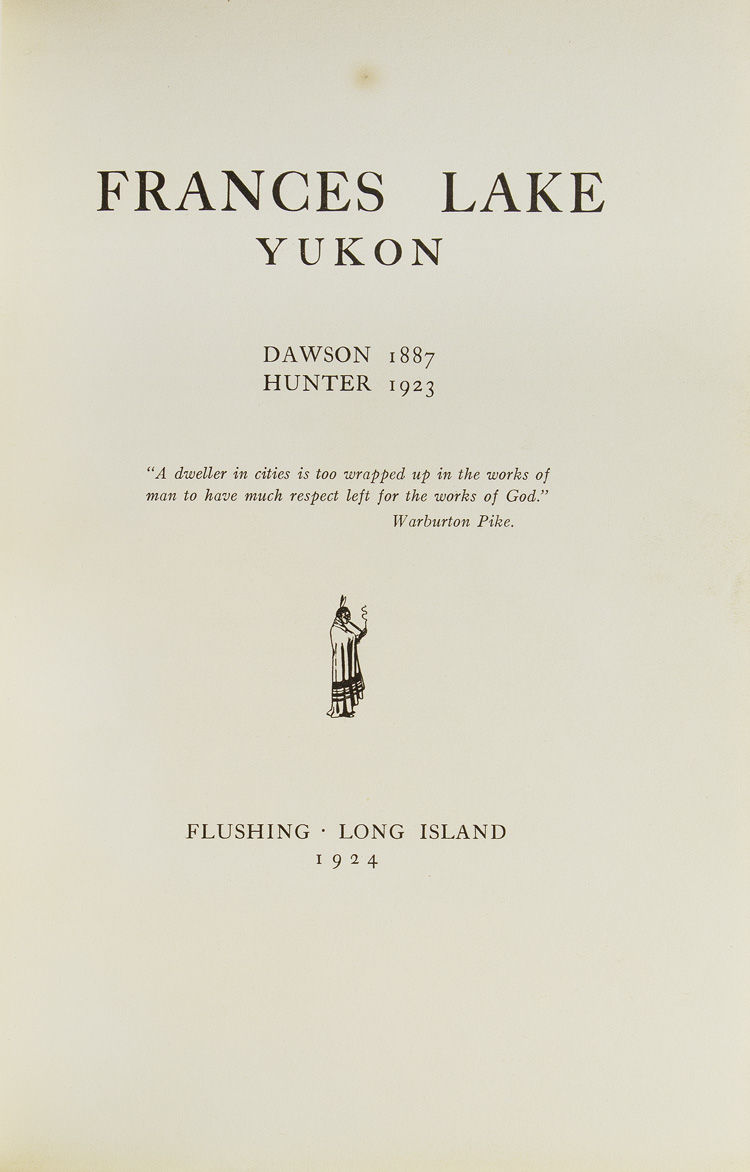The author thanks Charles Sheldon of Washington, D.C., in the Apologia for giving him the idea to search for sheep at Frances Lake. Hunter retraced some of the 1887 explorations of George M.Dawson, published in The Yukon Territory (1898), which collected acounts by Dall, Dawson, and Ogilvie. Streeter 3627; Phillips, p. 190. Larremore, The Marion Press no. 183 & pp. 150 & 160; Not in Heller
