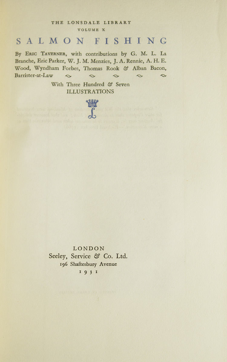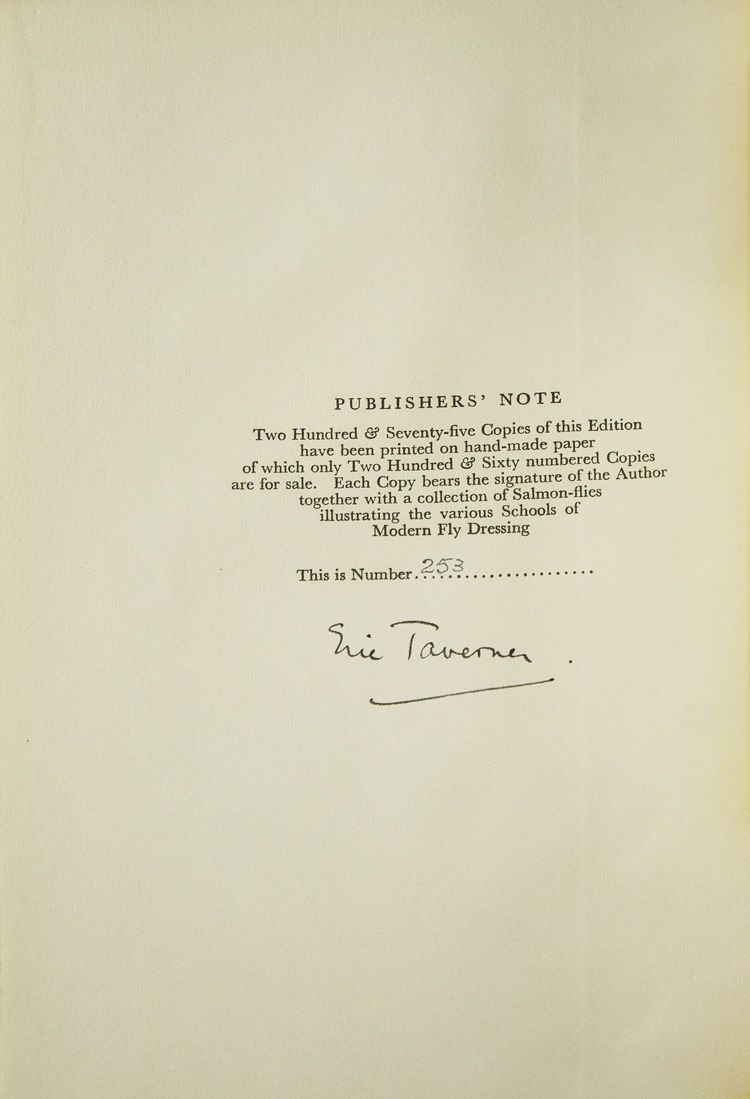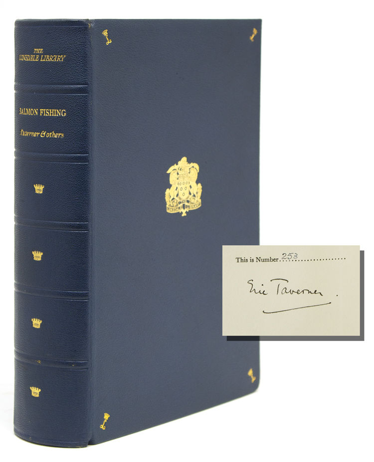 London: Seeley, Service, 1931. First edition, np. 253 of 275 copies, printed on hand-made paper, signed by the author. With 111 plates and 214 illustrations in text, 3 maps. 472 pp. With seven specimen flies by Hardy Bros., "illustrating the various schools of Modern Fly Dressing," mounted at back. 1 vols. Thick 8vo. Publisher's full blue pebbled morocco, t.e.g., others uncut. Lower cover slightly bowed, else fine. Bookplate of Henry A. Portong. First edition, np. 253 of 275 copies, printed on hand-made paper, signed by the author. With 111 plates and 214 illustrations in text, 3 maps. 472 pp. With seven specimen flies by Hardy Bros., "illustrating the various schools of Modern Fly Dressing," mounted at back. 1 vols. Thick 8vo. The seven flies include the March Brown and Blue Charm (A.H.E. Wood); the Pink Lady dry fly (G.M.L. La Branche); Gipps (A.H. Chaytor); Sally (T.E. Price Tannatt); Black Silk (E. Crossfield); and Turkey Jackson (J. Jackson). Bruns T9; Litchfield p. 88; Bibliotheca Salmo Salar 166