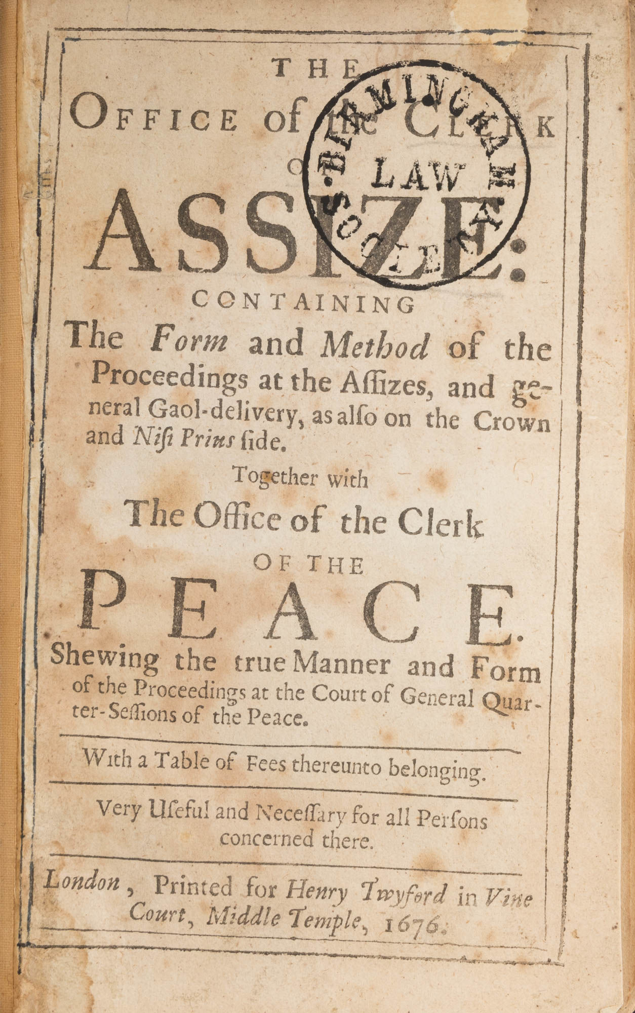 1676. Very Useful and Necessary for All Persons" T.W. The Office of the Clerk of Assize: Containing the Form and Method of the Proceedings at the Assizes, And General Gaol-Delivery, As Also on the Crown and Nisi Prius Side. Together with the Office of the Clerk of the Peace. Shewing the True Manner and Form of the Proceedings at the Court of General Quarter-Sessions of the Peace. With a Table of Fees Thereunto Belonging. Very Useful and Necessary for All Persons Concerned There. London: Printed for Henry Twyford, 1676. [xii], 153, [7] pp. Lacking first leaf with order to print. Octavo (5-3/4" x 3-1/2"). Later sheep, blind frames to boards, blind fillets and gilt title and date to spine, edges rouged. A few shallow scratches and faint stains to boards, light rubbing to extremities, somewhat heavier to joints, which are starting at head, corners lightly bumped, hinges starting, library bookplate and small circular shelf label to front pastedown. Moderate toning to interior, occasional very light foxing, a few cracks to text block, leaves A4-B7 detached, a few other leaves loosening slightly but secure, minor worming to upper corner of last ten leaves without loss to text, title page, which has an ink library stamp along with several other leaves, laid down and reinforced at gutter, small mended chip to gutter of following leaf without loss to legibility, a few leaves mended at fore-edge not affecting text. $450. * Second, expanded edition. First published in 1660 as The Clerk of Assize, Judges-Marshall, And Cryer, this manual addresses judicial administration and procedure in the civil and criminal courts. Subsequent editions were published in 1682 and 1684. All are scarce; OCLC locates 3 copies of the 1676 edition in North American law libraries (Harvard, Library of Congress, Los Angeles County). English Short-Title Catalogue R5245.
