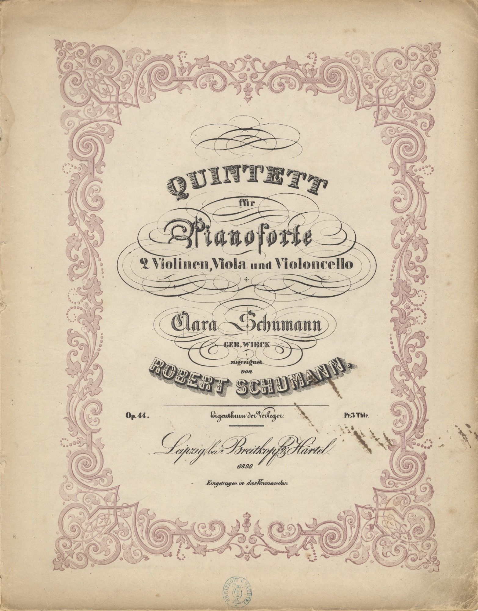 Quintett für Pianoforte 2 Violinen, Viola und Violoncello Clara Schumann geb. Wieck zugeeignet ... Op. 44. Eigenthum der Verleger. Pr: 3 Thlr ... 6899 ... Eingetrugen in das Vereinsarchiv. [Parts]