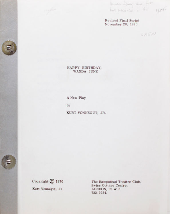 The hampstead Theatre Club Swiss Cottage Centre, 1970. Revised Final Script. Printed recto only. [85] leaves. 4to. Grey stiff wrappers. Revised Final Script. Printed recto only. [85] leaves. 4to. Preceds film and first book publication in 1971. OCLC 3 copies