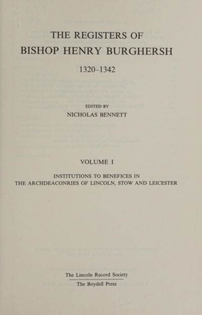 Woodbridge and Rochester: Lincoln Record Society, Boydell Press, 2003. Volume II: Institutions to benefices in the archdeaconries of Northampton, Oxford, Bedford, Buckingham and Huntingdon, and collations of cathedral dignities and prebends. Edited by Nicholas Bennett. xi, 316p., original cream cloth (The Lincoln Record Soceity, 90).