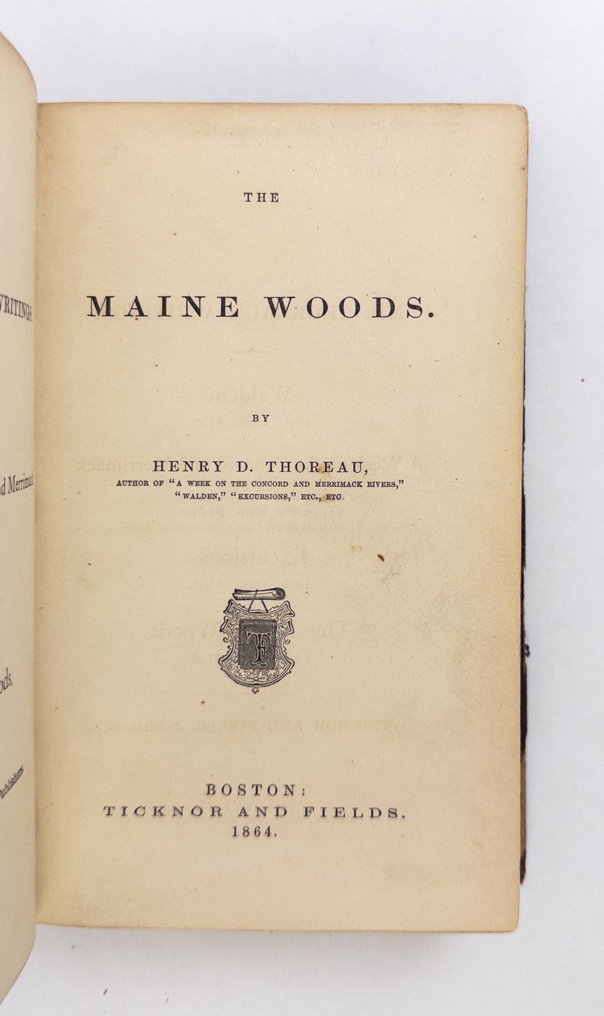 Boston: Ticknor and Fields, 1864. First Edition, Second Printing. Hardcover. Octavo, [i-viii], 1-328 pages. In Good minus condition. Bound in purple cloth with gilt lettering on sunned spine. Boards show significant splitting to front joint, partial splitting to rear joint, moderate rubbing to corners exposing boards, bending to corners, spine edges chipped off, sunning to spine, and boards exposed on head and fore edges of both covers. Text block has splitting to front and rear interior hinges, light foxing to some pages, bottom corner of page 35 missing. Ex library, with glue staining to pastedowns and endpapers, faded stamp to page 328. Presumed Second printing with no prices for Thoreau's other works, thought also no mention of second edition. Does not have publisher's catalog in rear. BAL 20113. Shelved in Room G. 1370596. Special Collections.