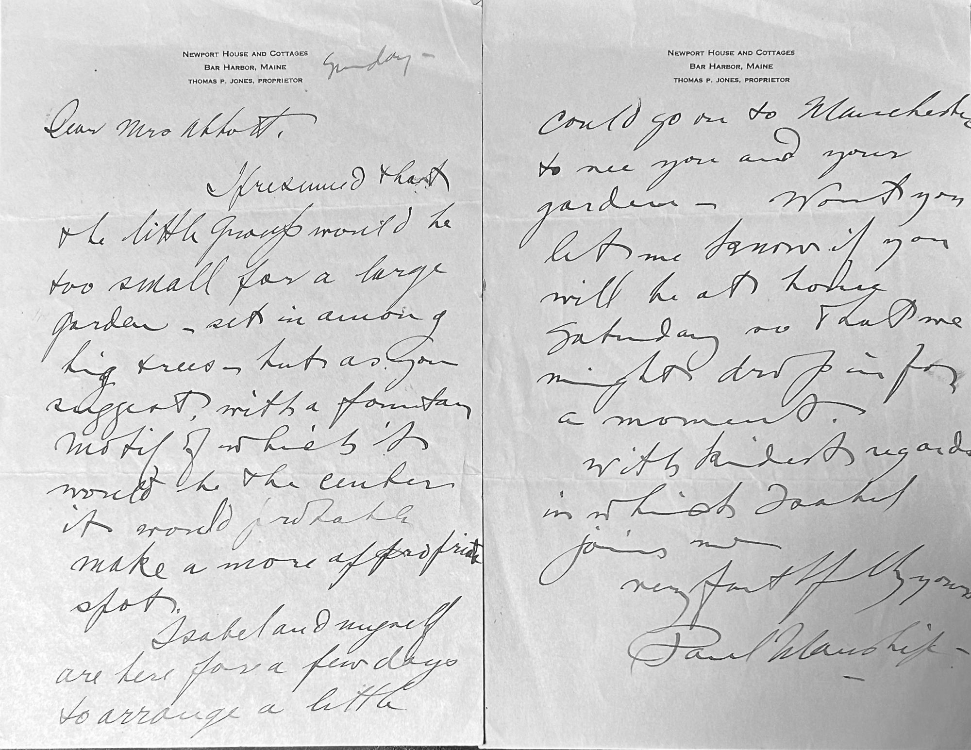 Nd: Np, Sunday. Wraps. Cream paper. Fine. 4 leaves, 23 x 15 cm. Letterhead: Newport House And Cottages, Bar Harbor, Maine -- Thomas P. Jones Proprietor. an undated ALS noted "Sunday." Manship discusses his stay in Maine was to arrange an exhibition of his works, and an offer to visit Mrs. Abbott with ideas for a set of scuptures for her garden. Paul Howard Manship was an American sculptor. He consistently created mythological pieces in a classical style, and was a major force in the Art Deco movement.