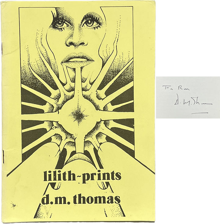 North Cardiff: Second Aeon Publications, 1974. First Edition. Paperback. Very Good. Inscribed by Thomas on the half-title. Very Good. Yellow wraps bumped and rubbed. Firmly bound with two staples, a few stray stains on the pages. An early poem from the Booker Prize winner that represents "an effort to see, within or behind the coldness of the pornographic photo and the sterility of contemporary sexology, the primal male-female mystery.