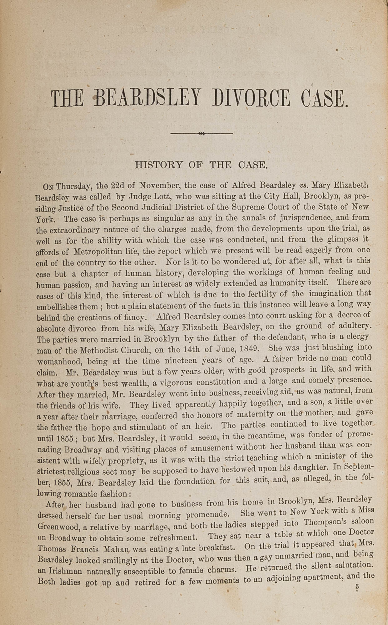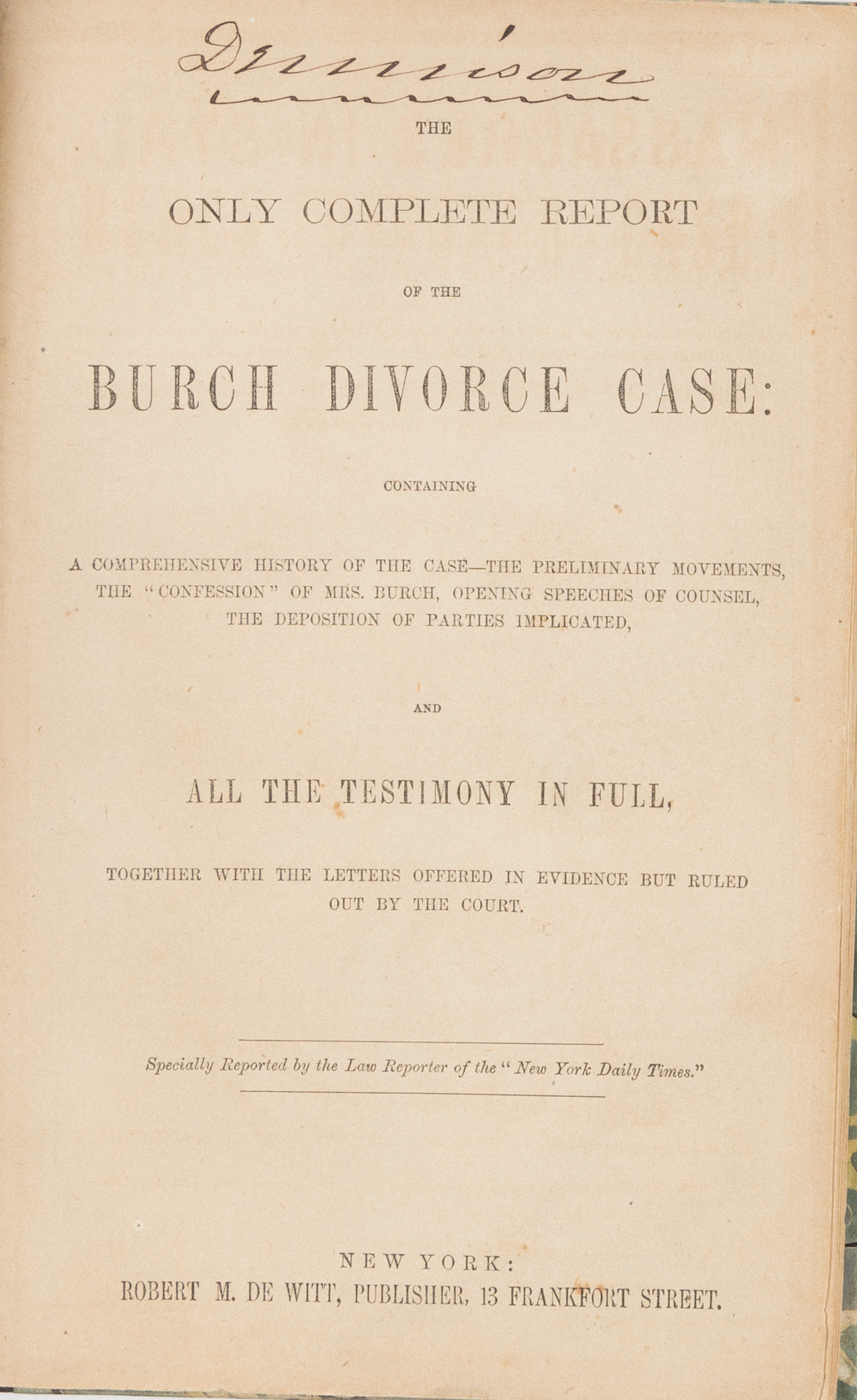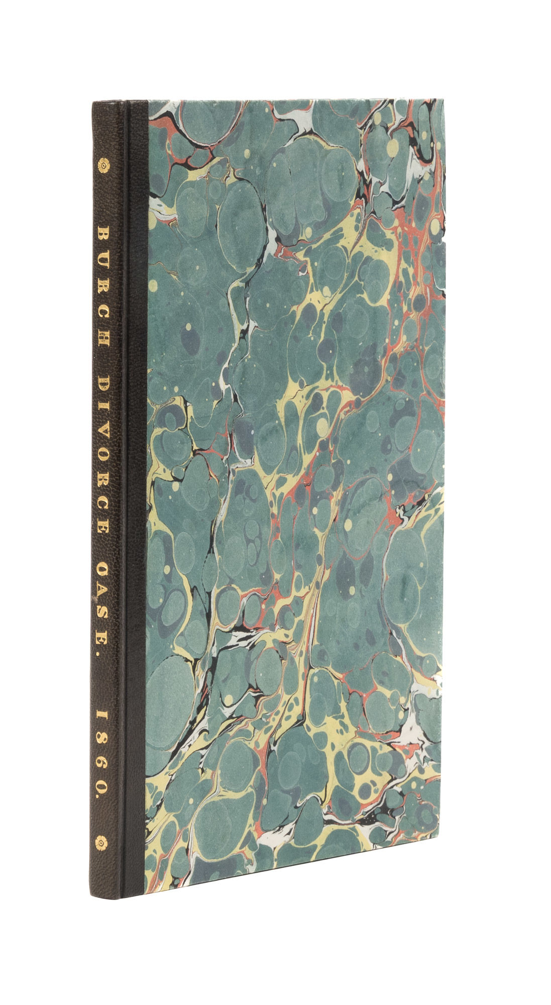 1860. An 1860 Illinois Divorce Case that Dominated Headlines Throughout the United States [Trial]. Burch v. Burch. Only Complete Report of the Burch Divorce Case; Containing a History of the Case--The Preliminary Movements, The "Confession" of Mrs. Burch, Opening and Closing Speeches of Counsel, The Deposition of Parties Implicated, and All the Testimony in Full, With the Letters Offered in Evidence but Ruled Out by the Court. New York: Robert M. DeWitt, Publisher, 30 Frankfort Street, [c.1860]. 116, [5]-8 pp. Main text in double columns. Pictorial wrappers lacking. Page [5] has drop-head title The Beardsley Divorce, sub-titled History of the Case, which is followed by a single-column account of that case. Octavo (6" x 9-1/2"). Stab-stitched pamphlet bound into recent quarter calf over marbled boards, gilt title to spine. Moderate toning to interior, light soiling to final page, early owner name (Dennison) to head of title page. A handsomely bound copy. $175. * Only edition, one of two issues. This sensational Illinois divorce case dominated headlines throughout the United States. It involved a prominent Chicago banker and his socialite wife, who denied his accusations of adultery and countered with charges that he married her for her fortune and had mistreated her. The jury agreed and ruled in her favor. Our copy is from the issue that includes a synopsis of the Beardsley Divorce, a case that involved adultery claims by both spouses. It is not included in the other issue, which does not have any additional material. The synopsis is apparently a promotion for DeWitt's report of that case, which is advertised on rear wrappers of copies in wrappers that we have seen. This issue not in Cohen or the Harvard Law Catalogue (1909), both of which record the issue with 116 pp.