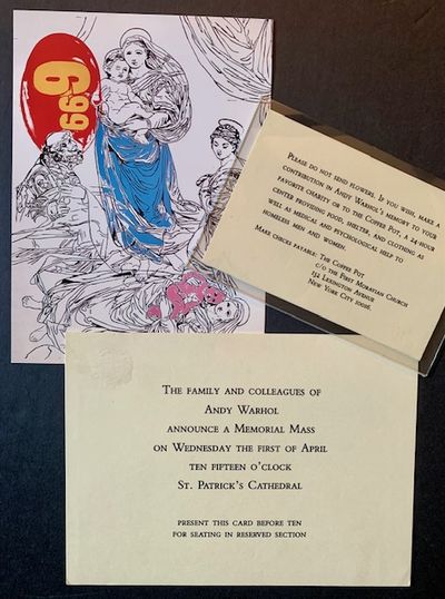 1987. Ephemera. Fine. An interesting cache of 3 separate pieces related to Andy Warhol's April 1st, 1987 Memorial Mass at St. Patrick's Cathedral in New York. All 3 crisp and bright in beautiful, near pristine condition. The first, postcard-sized and with a Warhol illustration ("Raphael I") on the front cover, features the line-up of events for the Mass itself. The speakers are John Richardson, Yoko Ono and Nicholas Love; The second, also postcard-sized, is the formal announcement for the Mass ("Present the Card before Ten for Seating in Reserved Section"); And finally, the 3rd is an announcement from "The Coffee Pot c/o The First Moravian Church" in New York, requesting that mourners not send flowers. "If you wish, make a contribution in Andy Warhol's memory to your favorite charity or to The Coffee Pot, a 24-hour center providing food, shelter and clothing as well as medical and psychological help to homeless men and women". A fascinating trove -- and a reminder of the tragedy of Warhol's untimely death at age 58, apparently following "routine" gall bladder surgery.