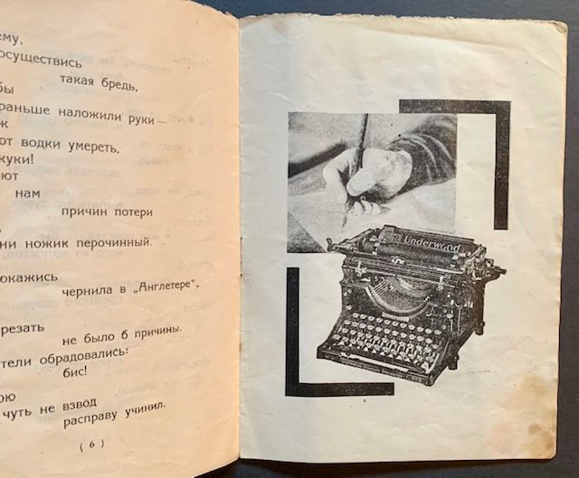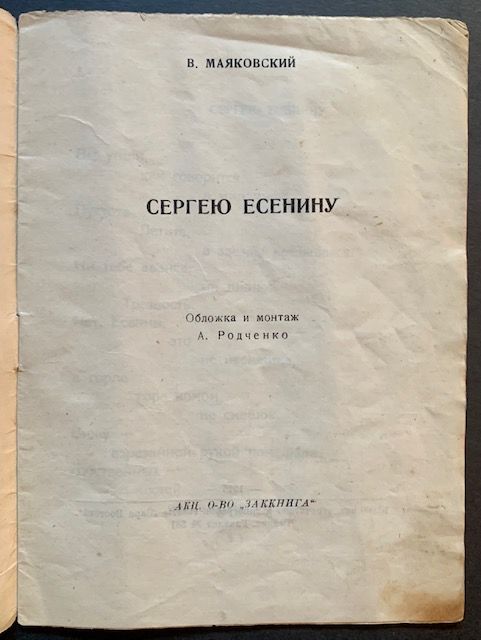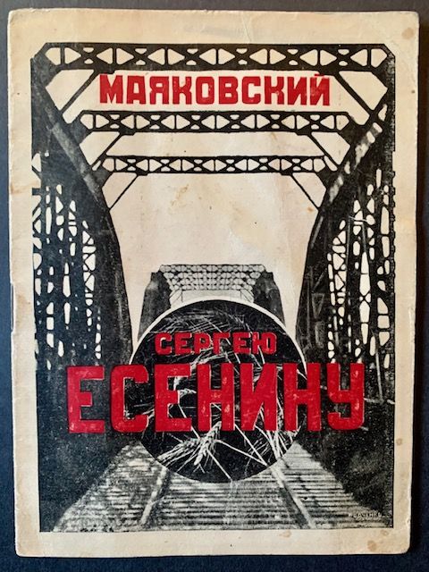 Moscow: Vladymir Mayakovsky, 1926. Pictorial wrappers. Very Good +. Alexander Rodchenko. An uncommon example of 1926 post-Revolution poetry AND Constructivist design, with the work of 2 giants of Russian Futurism and Constructivism, Vladymir Mayakovsky (1893-1930) and Alexander Rodchenko (1891-1956) here on display. Published by Mayakovsky, this slim, 16 pg. book, which features Mayakovsky's "denunciating" poetry following the suicide of Russian poet Sergei Yesenin (1895-1925), features 2 original photomontage wrappers and 2 photomontage plates designed by Rodchenko. Fragile and yet crisp and VG in its wonderful stapled wrappers, with light staining along the rectos' lower-edges and mild creasing throughout. In its original Russian, title here translated into English.