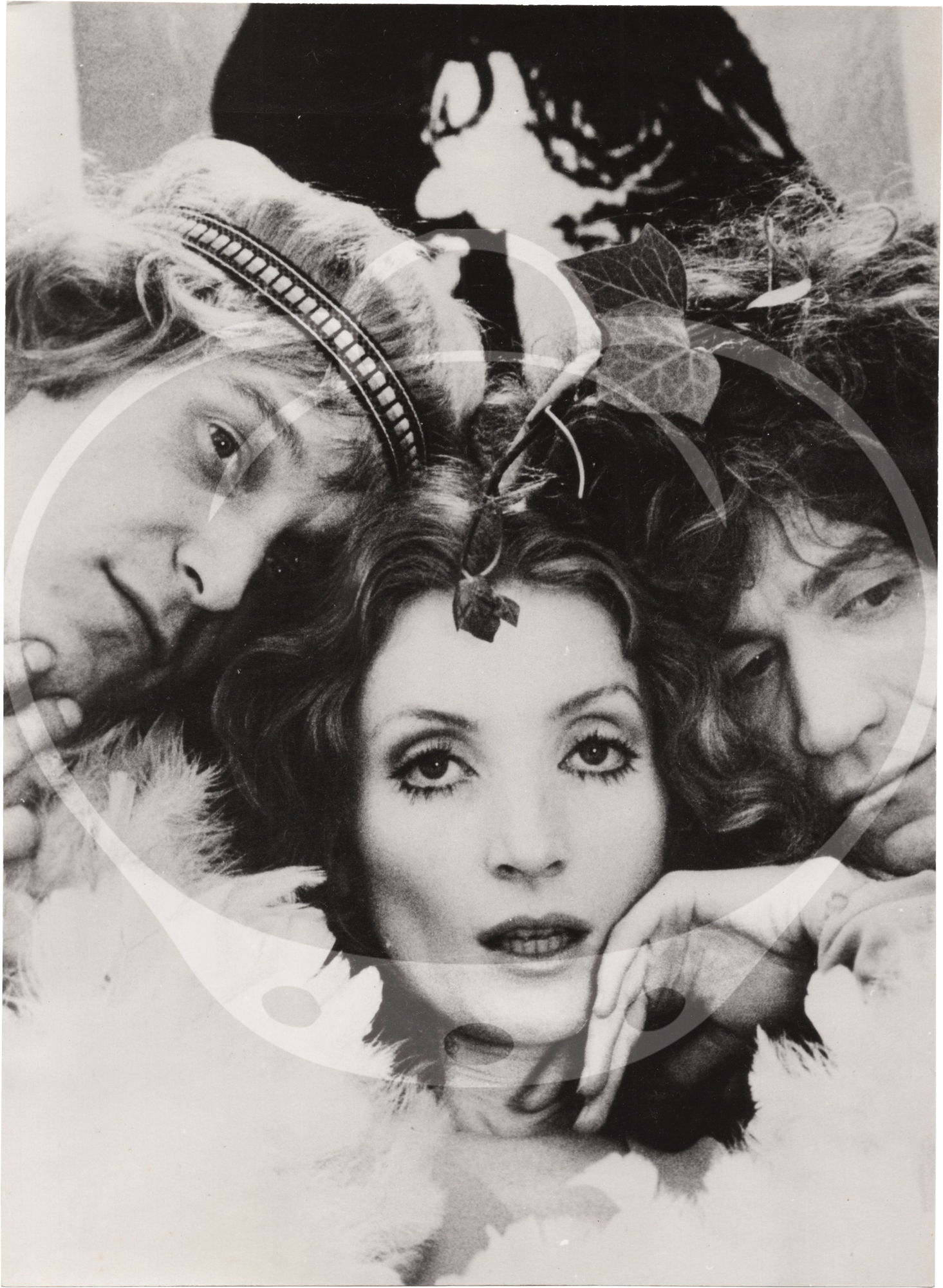 N.p.: N.p., 1969. Two vintage reference photographs from the 1969 film, one borderless and one bordered, both showing Viva, James Rado, and Gerome Ragni. Annotations in manuscript ink and pencil on the versos.