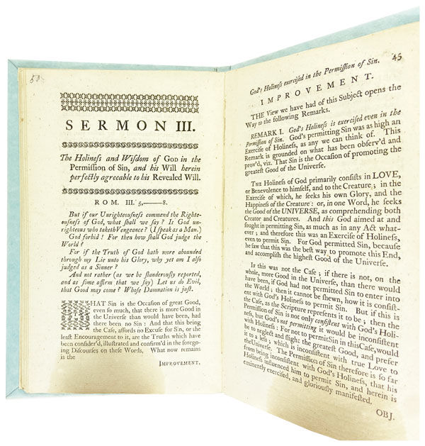 Collection of three sermons on the subject of sin delivered by Samuel Hopkins (1721-1803), a student of Jonathan Edwards'.