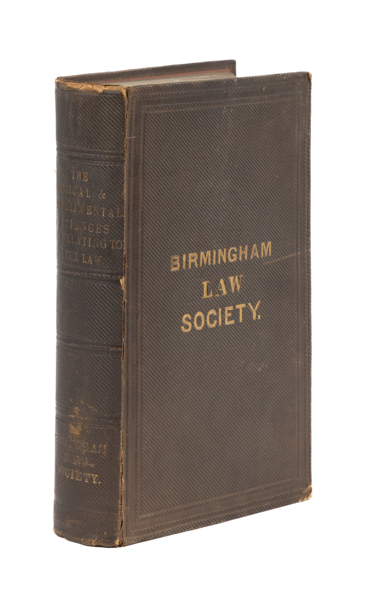 1835. The Application of Scientific and Logical Methods to Legal Practice [Practice]. [Great Britain]. Elements of the Logical and Experimental Sciences Considered in Their Relation to the Practice of the Law. London: Henry Butterworth, Law Bookseller and Publisher, 1835. viii, [2], 500; 39, [1] pp. Main text followed by 40 pp. Butterworth catalogue, additional Butterworth advertisements to endleaves. Octavo (8-3/4" x 5-1/2"). Contemporary pebbled cloth, blind frames and gilt library name and insignia to boards, gilt title and library name to spine. Light rubbing, chipping to head of spine, title dulled, light wear to foot of spine, joints starting, moderate wear to corners, hinges cracked, bookplate and small location mark and label to front pastedown. Light toning to interior, faint spotting to margins in a few places, library stamps and minor finger smudges to title page and a few other leaves. $650. * Only edition. Written by an unidentified author, this curious book describes ways to apply principles from logic and the natural sciences, such as hydrodynamics and optics, to legal practice. This is a scarce title. OCLC locates 3 copies in North American law libraries (LA County, University of Chicago, University of Pennsylvania). Not in Sweet & Maxwell. British Museum Catalogue (Compact Edition) 8:18.