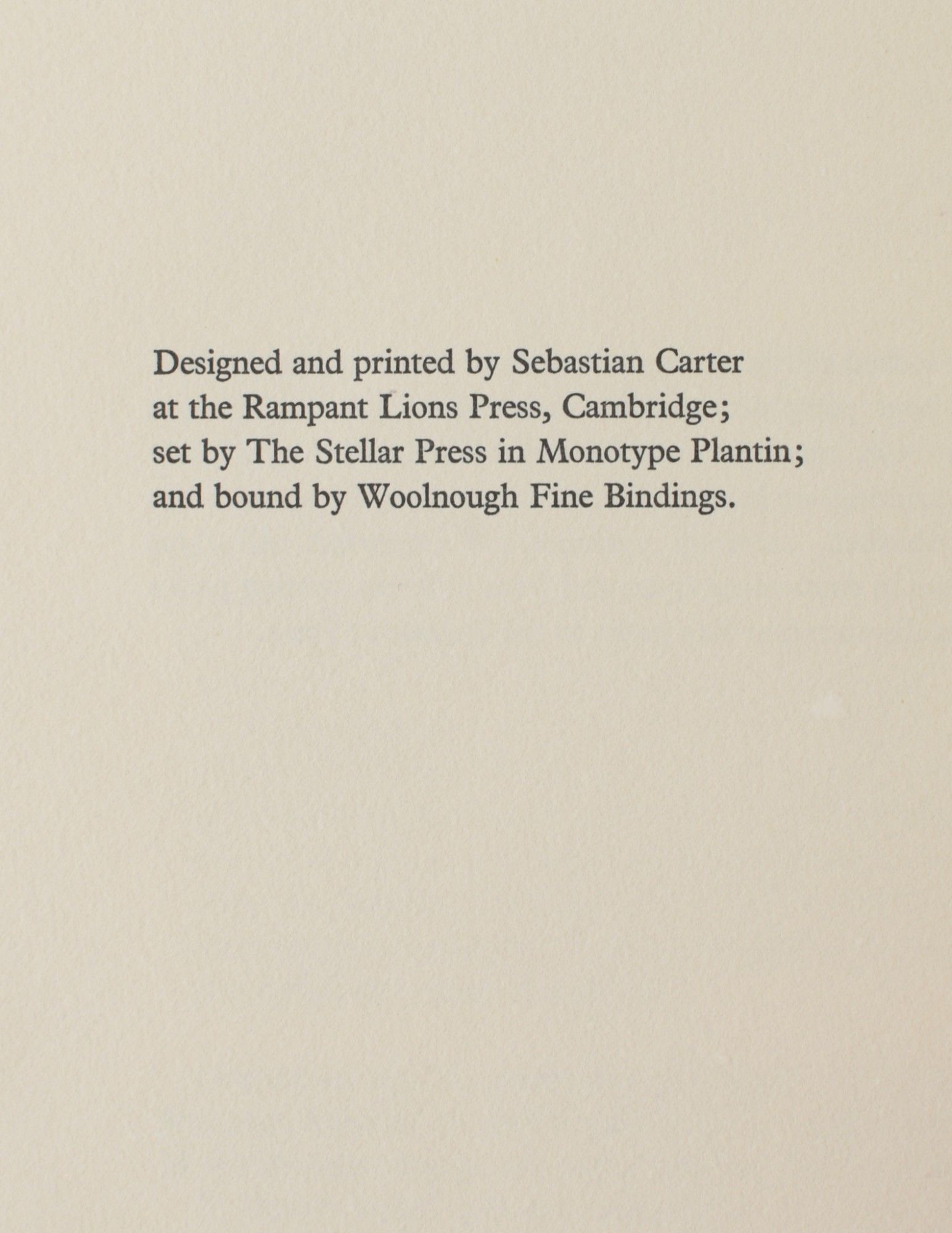 [Cambridge: The Rampant Lions Press, 1986. Limited Edition. Quarter Leather. Fine binding. Large 8vo.; in Barcham Green Canterbury handmade patterend paper boards, backed in navy morocco, with title lettered in gilt to the spine; 58 pages, with the title page printed in black and in blue; housed in a paper-covered slipcase with a paper title label; the slipcase has minor toning to the edges; one of 50 copies from a larger edition of 505 copies. Fine binding.