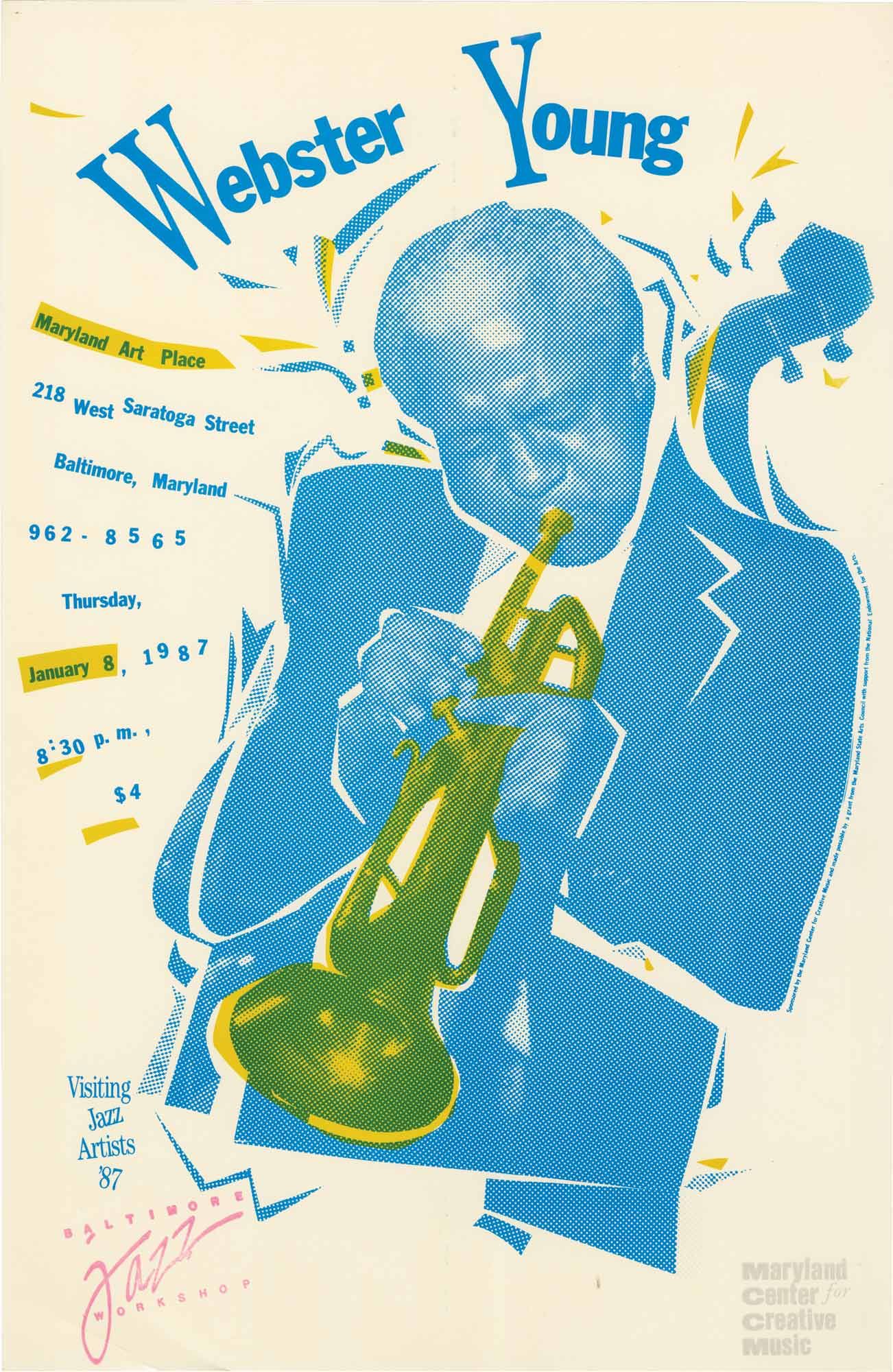 Baltimore: Maryland Center for Creative Music, 1987. Vintage four-color Webster Young poster for a "Visiting Jazz Artists '87" performance at Maryland Art Place (MAP), January 8, 1987, for the Baltimore Jazz Workshop and hosted by the Maryland Center for Creative Music.