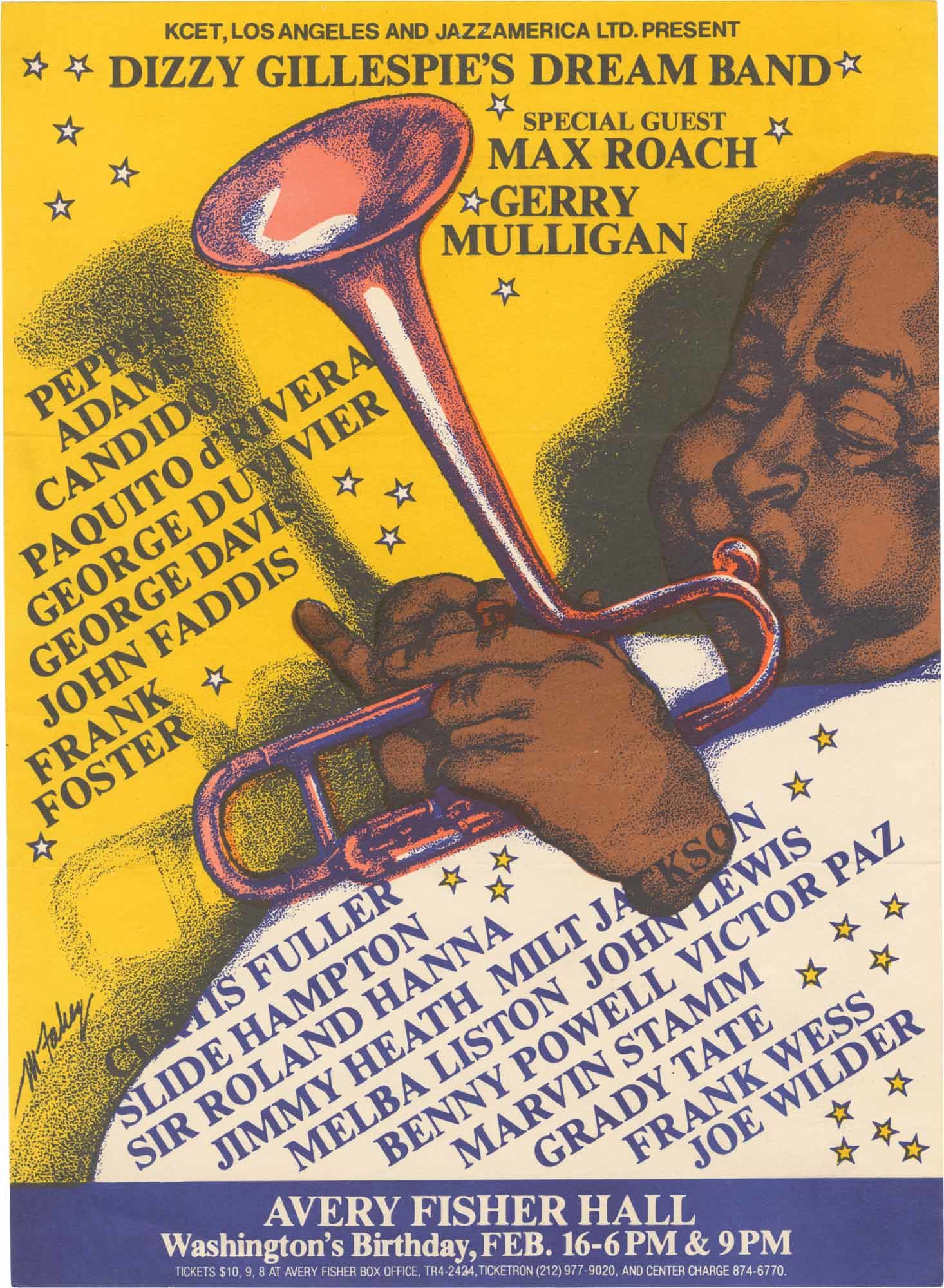 The legendary concerts at Avery Fisher Hall consisted of two performances on February 16, 1981. The first was a smaller ensemble featuring Gillespie and bop veterans, Milt Jackson, John Lewis, Gerry Mulligan, and Max Roach, and the second was Dizzy Gillespie's Dream Band, consisting of Pepper Adams, Candido, Paquito d'Rivera, George Duvivier, Goerge Davis, John Faddis, Frank Foster, Chris Fuller, Slide Hampton, Roland Hanna, Jimmy Heath, Milt Jackson, Melba Liston, John Lewis, Benny Powell, Victor Paz, Marvin Stamm, Grady Tate, Frank Wess, and Joe Wilder. The two concerts that evening were filmed and released on video as the documentary "Jazz in America: Dizzy Gillespie Dream Band" in 1982.