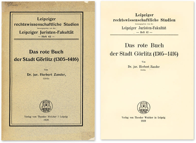 1929. A Compilation Based on the Sachsenspiegel Zander, Herbert. Das Rote Buch der Stadt Gorlitz (1305-1416). Leipzig: Verlag von Theodor Weicher, 1929. [iv], 76 pp. Softbound, light wear to extremities, corners of covers and front hinge reinforced with clear archival tape, internally clean. Uncommon. $20. * A title in the series Leipziger Rechtswissenschaftliche Studien. Das Rote Buch, or Gorlitz Lawbook, is one of the first legal compilations based on the Sachsenspiegel. Zander's essay is an overview and analysis of the Gorlitz compilation.
