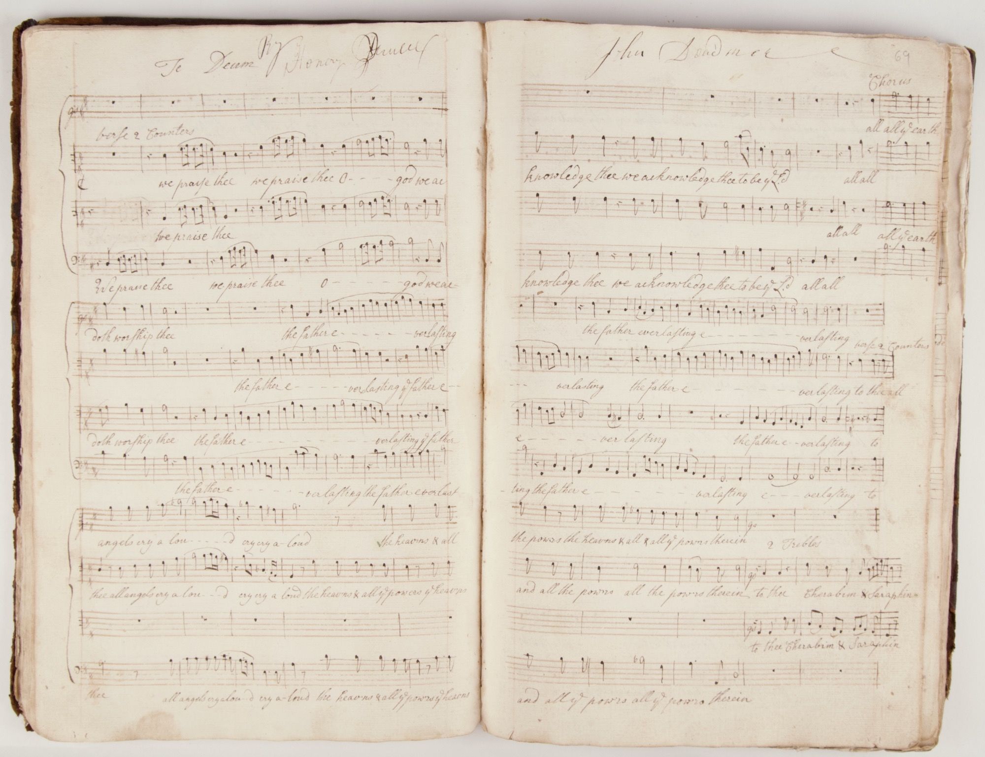 Musical manuscript collection of 23 anthems and other liturgical vocal music including Purcell's Te Deum