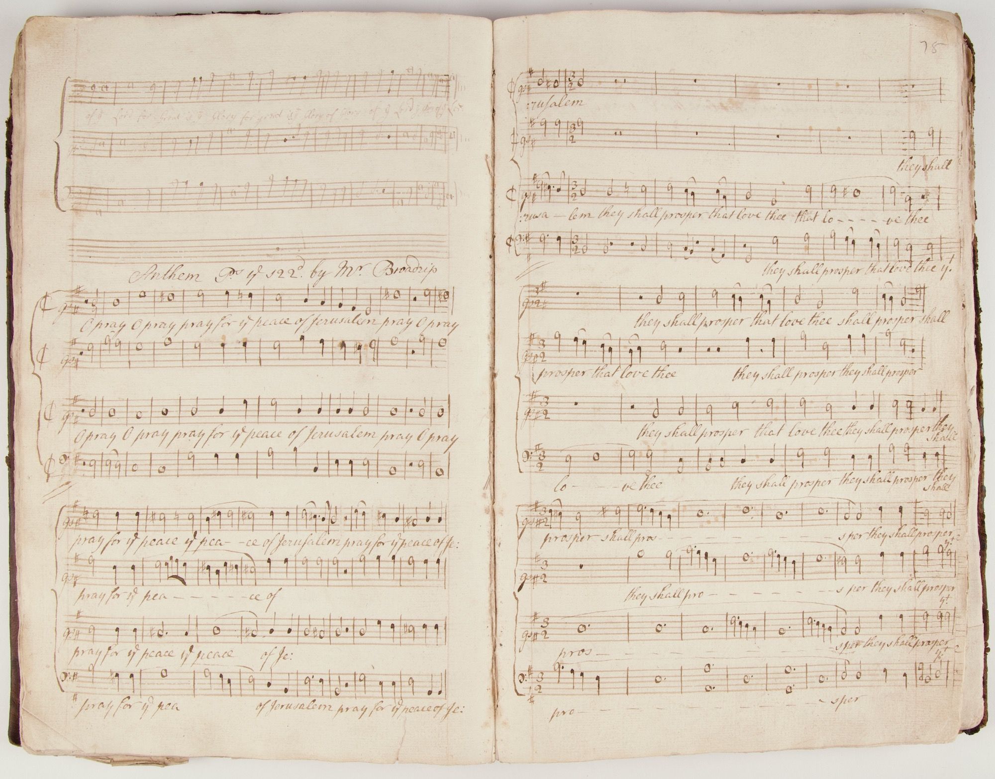 17) [?]Broderip, William 1683-1727. Anthem for ye 122d by Mr. Broadrip, "O pray for ye peace," pp. 74-81. Not in RISM.