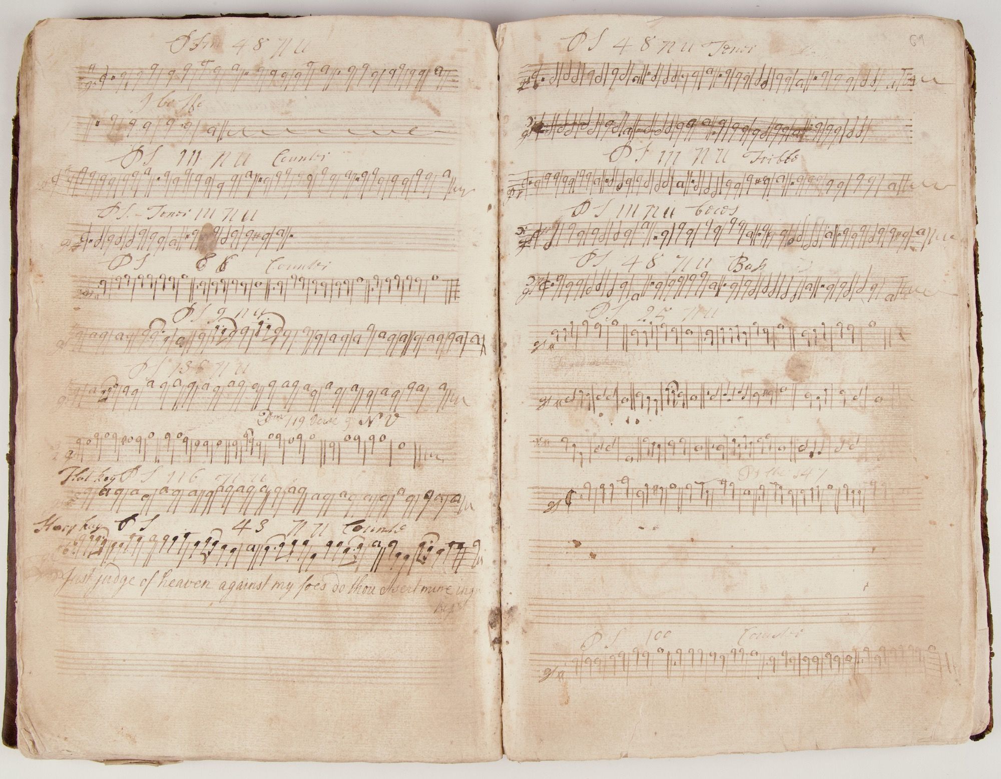 14) An Anthem Ps[alm] 103, "The L[ord] is full of Compation," pp. 60-65, with a stave designated for the bass line but lacking it.