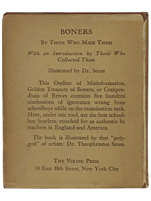 New York: The Viking Press, 1931. 4th Printing. Hard Cover. Very Good/Fair. 0x0x0. Dr. Seuss (Geisel, Theodore Seuss). 4th printing. Very good in fair jacket. Ink gift note on front endpaper, two large chips from front jacket edge, some loss from jacket spine head and foot, jacket spine faded. 1931 Hard Cover. viii, 89, [3] pp. A collection of humorous errors in phrasing, together with illustrations by the famous Dr. Seuss, though this work was published over five years before the release of his first children's book in 1937. From the foreword: "With the success of Boners, misinformation has finally assumed its rightful place in the American home, relegated the more exact sciences to the dusty cupboards and shelves. The pyorrhean springs of knowledge have dried up; educators have been forced to change their systems of grading ("E" is now Summa cum laude; "A" is once again a scarlet letter)... The Millennium is at hand. Down with Information!