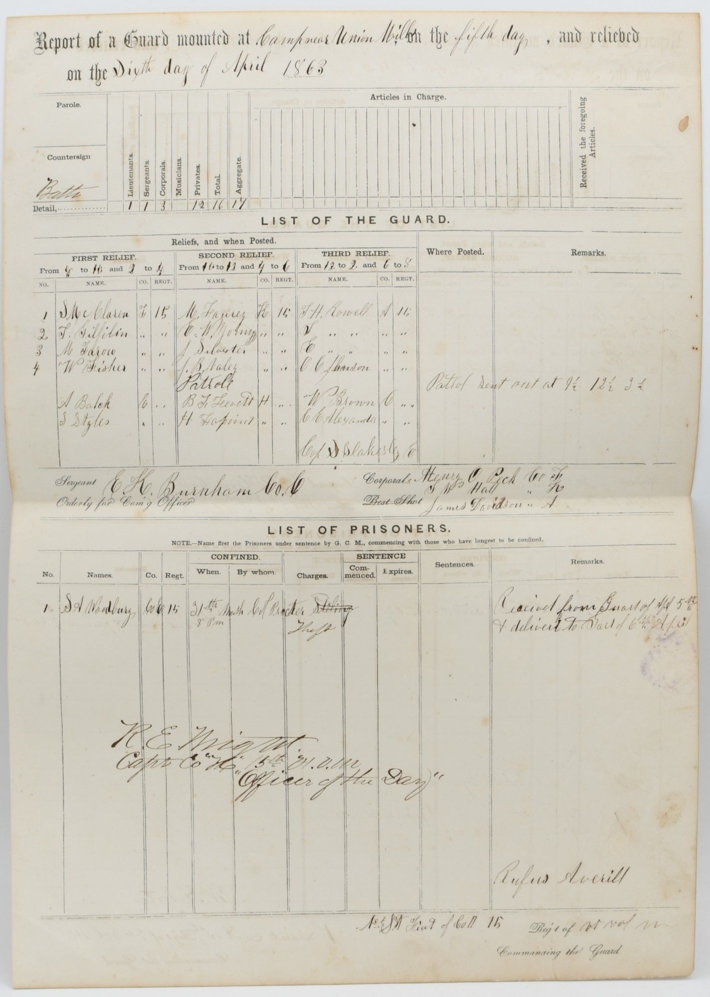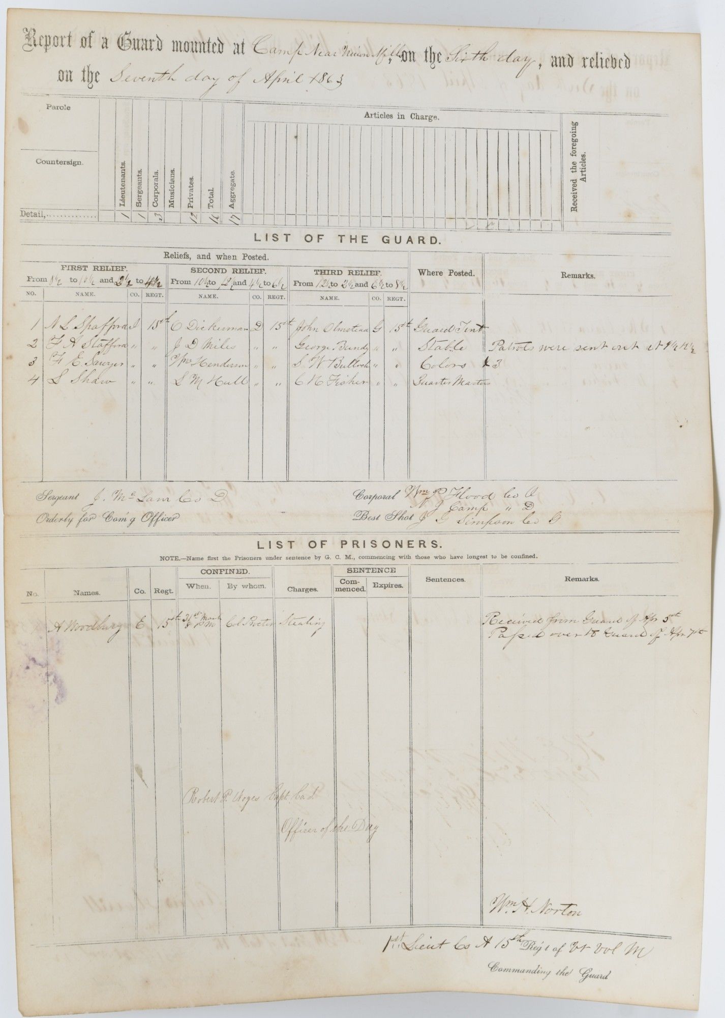 Broadsheet (14 3/8" x 10 1/8") folded; Report of a Guard mounted at "Camp Near Union Mills" on the "Sixth Day" and relieved on the "Sixth day of April 1863" detailing the number of prisoners, the List of the Guard; and List of Prisoners; signed by the Officer of the Day, and the officer "Commanding the Guard"; on the verso is written the information for the "Seventh Day of April, 1863".~~The Report is from "near Union Mills" and is dated about three months prior to the Battle of Gettysburg. ~~Printed with much information in manuscript.