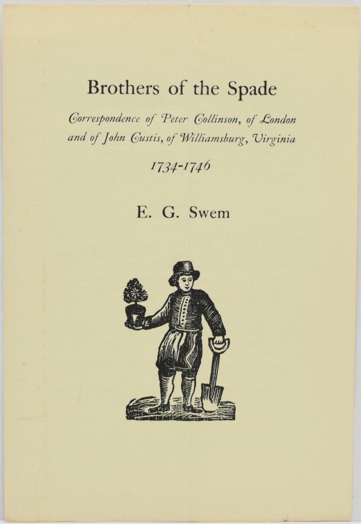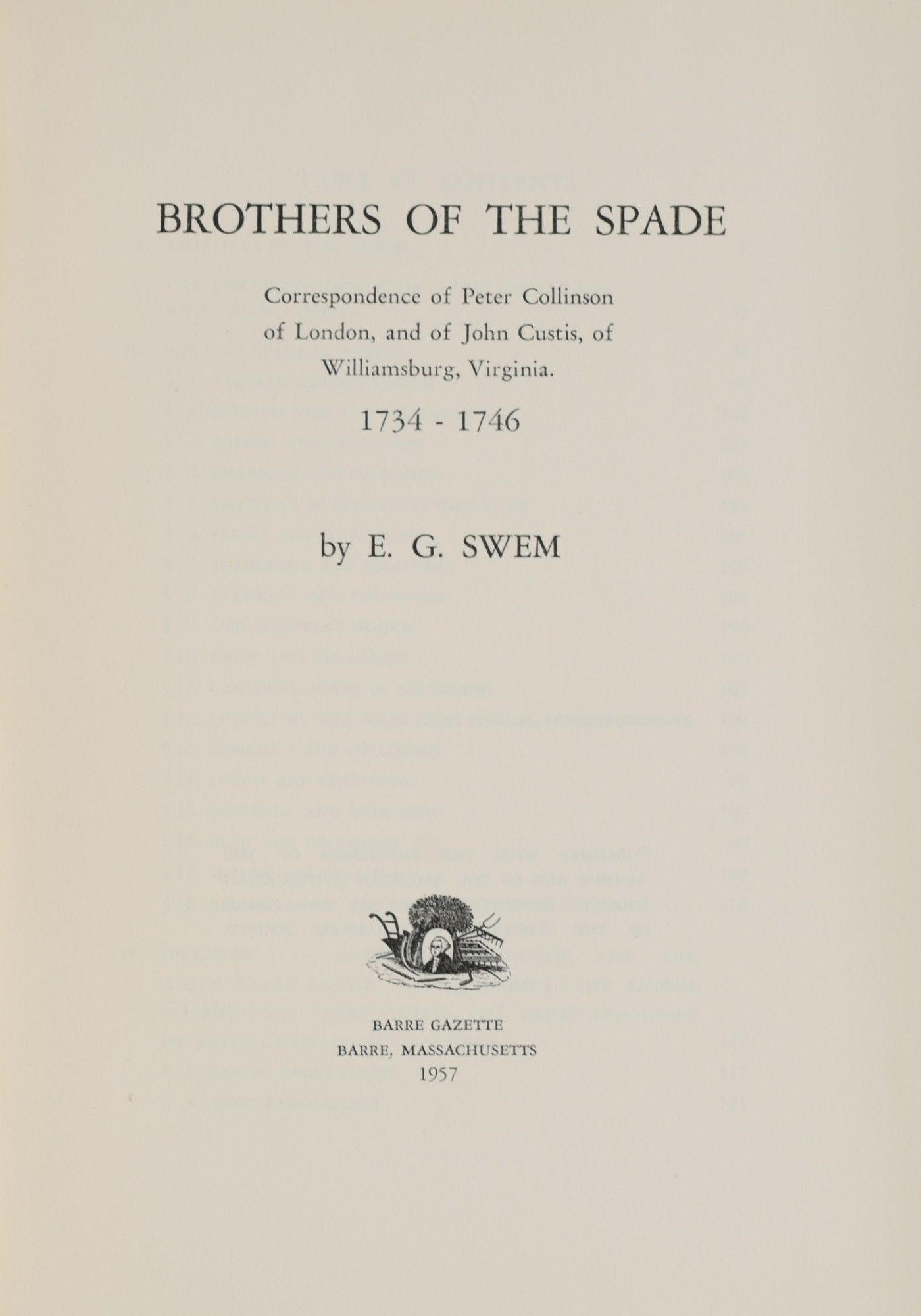 [ASSOCIATION COPY] BROTHERS OF THE SPADE: CORRESPONDENCE OF PETER COLLINSON, OF LONDON, AND OF JOHN CUSTIS, OF WILLIAMSBURG, VIRGINIA 1734-1746