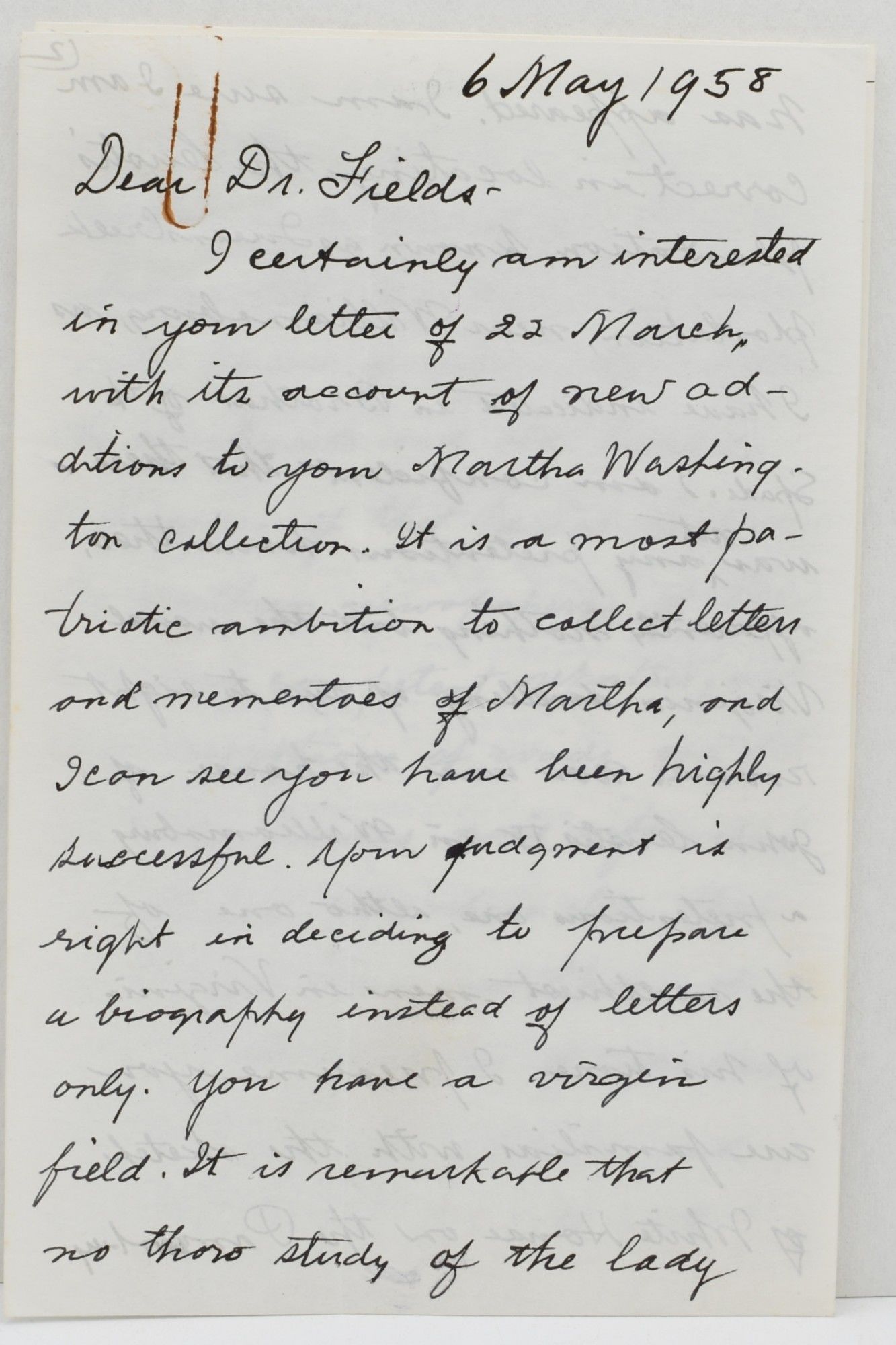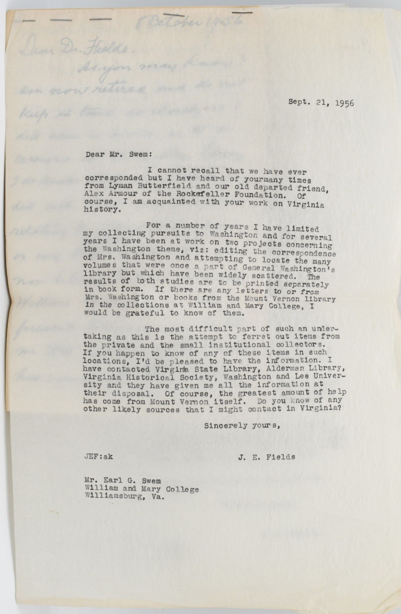 Barre, Massachusetts: Barre Gazette, 1957. First Edition. Hard Cover. Very Good binding/Very Good dust jacket. 8vo.; in the publisher's green cloth with dustjacket; 196 pages, including the Index; the dustjakcet has a closed tear and minor chipping; it has not been price-clipped; there is a previous owner signature on the endpaper and a gift inscription on the half-title page.~~This copy has several letters laid in: an eight page, six pagen and three page als from the author Mr. Swem, to Joseph Fields concerning Field's research into the Washingtons along with copy of Fields' typed replies. The book concerns letters between Peter Collinson and John Custis of Williamsburg on plants and gardening. A copy of the prospectus is also laid in. On the pastedown the Joseph Fields' attractive bookplate, which has a facsimile of George Washington's signature. Very Good binding / Very Good dust jacket.