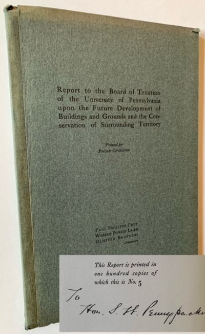 Philadelphia: The Commision of the Olmsted Brothers, 1913. Original wraps. Near Fine. A handsome copy of this uncommon 1913 report issued to the Board of Trustees of the University of Pennsylvania regarding further development and continued expansion of the campus. For "private circulation" and llimited to only 100 copies (this being #5). Clean and Near Fine in its charcoal-gray wrappers, with just a touch of very light wear at the spine ends. "The report is presented in five parts" and includes large fold-out maps and diagrams at the rear. The maps and diagrams cover: Part I: Past Growth and Present State of the University; Part II: A Discussion of Traffic Conditions; Part III: Suggested Developments in the Neighborhood of Woodland Ave.; Part IV: Suggested Developments along the River Front; and Part V: General Considerations. A nice piece of early 20th century University of Pennsylvania history.