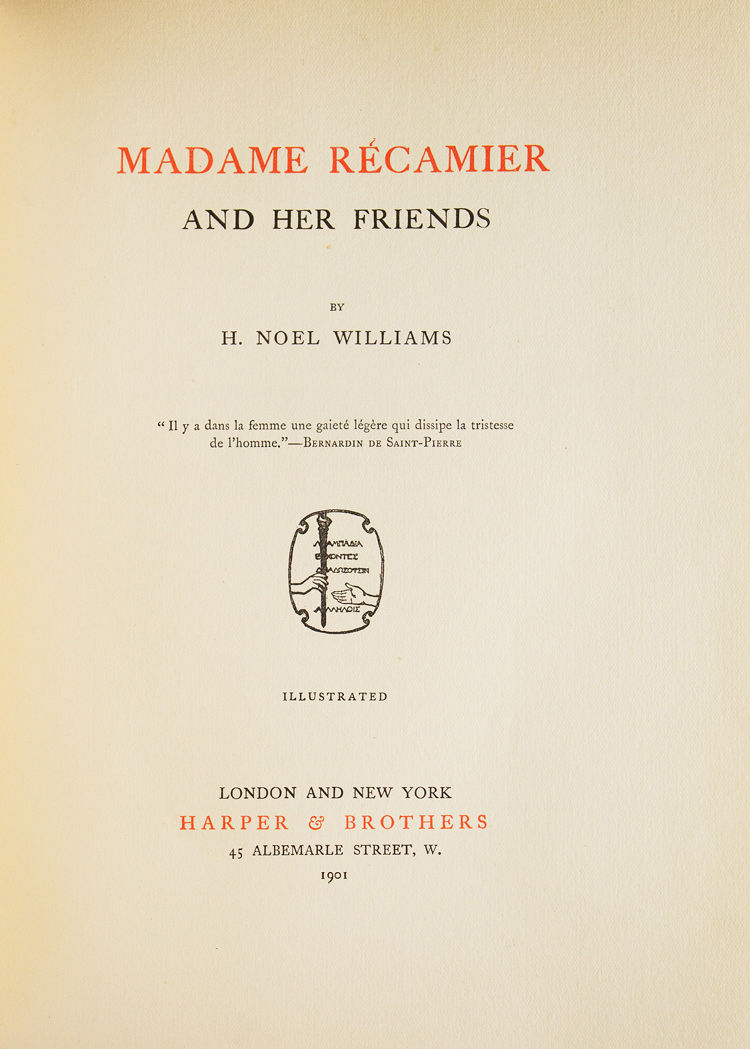 London and New York: Harper & Brothers, 1901. First edition, Number 370 of 600 copies, signed. Illustrated. xiv, 350pp. 4to. Full brown morocco with a Cosway style miniature on the upper cover of Madame Récamier reclining after Jacques-Louis David, a.e.g., by Bayntun (Riviere) Bath, England. Fine, in brown cloth dropbox. First edition, Number 370 of 600 copies, signed. Illustrated. xiv, 350pp. 4to.
