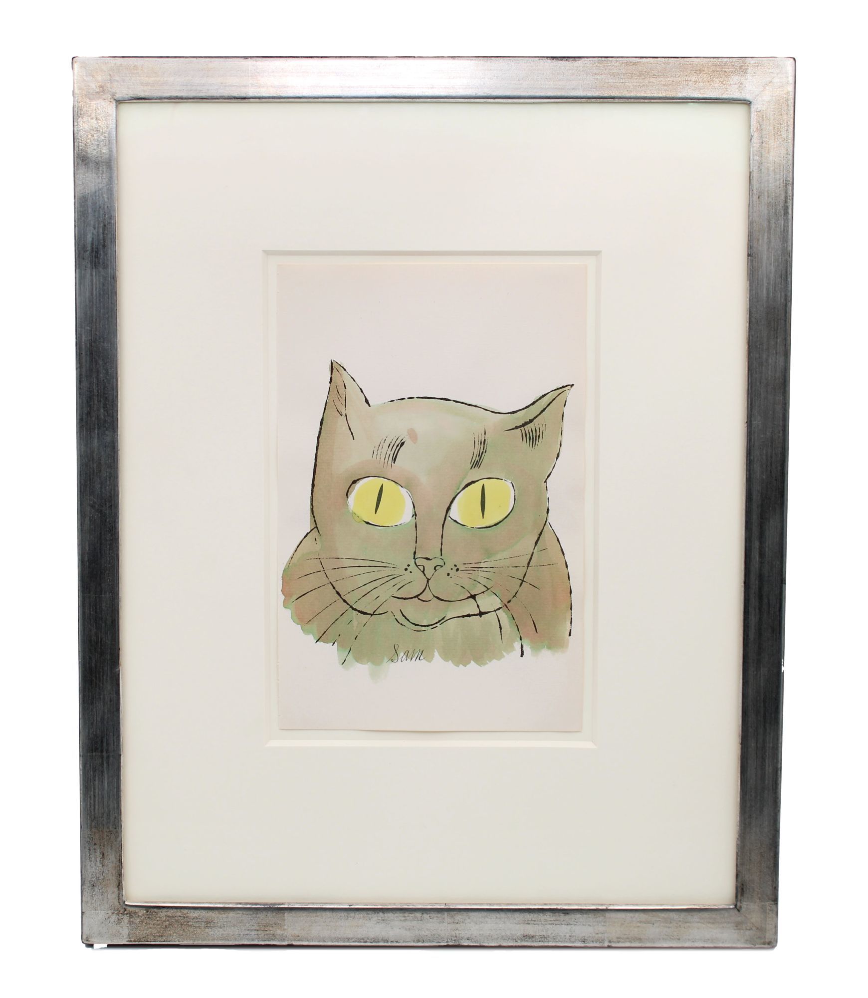 [New York: Printed for the Artist by Seymour Berlin, 1954. Edition of 190. Offset lithograph hand colored by Warhol and friends with Dr. Martin's aniline watercolor dye on Ticonderoga Text watermarked laid paper. 8-3/4 x 5-3/4 inches (matted and framed to 17 x 13-1/2 inches). Handmade white gold frame with acrylic glazing. Fine. Edition of 190. Offset lithograph hand colored by Warhol and friends with Dr. Martin's aniline watercolor dye on Ticonderoga Text watermarked laid paper. 8-3/4 x 5-3/4 inches (matted and framed to 17 x 13-1/2 inches). A plate from the early Warhol book 25 Cats Name Sam and One Blue Pussy.