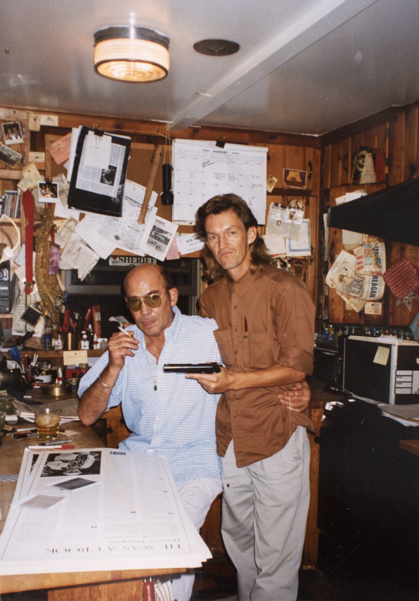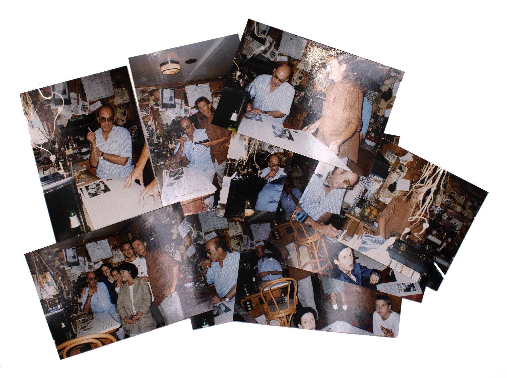 Louisville, 1995. Nine 4" x 6" color photographs. Nine [4" x 6"] photographs. Also included is an empty envelope postmarked from India with a stamp stating "Office of His Holiness the Dalai Lama" on recto and postmarked in Kentucky on verso; fine. Nine 4" x 6" color photographs. Candid photographs of Hunter Thompson and colleagues at White Fields Press in Louisville, Kentucky laying out the broadside for his 1994 eulogy of Nixon, originally published in The Atlantic.