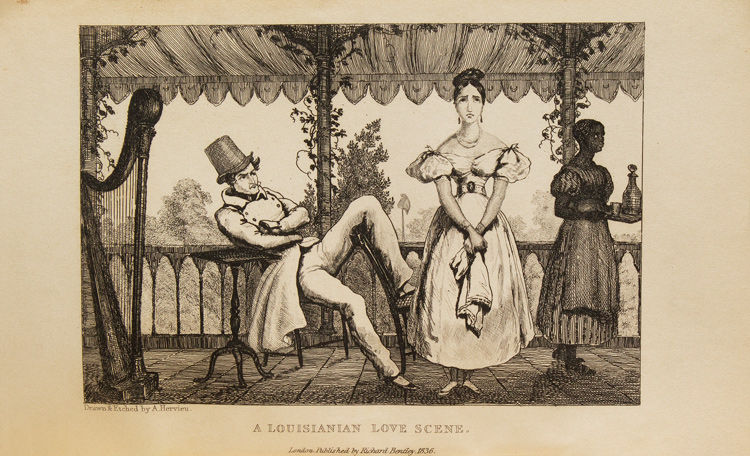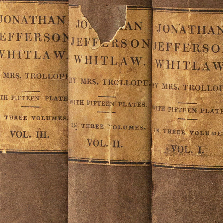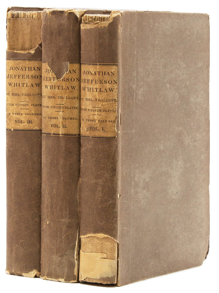 London: Richard Bentley, New Burlington Street [Colophon:] London: Printed by Samuel Bentley, Dorset Street, Fleet Street, 1836. First edition. With 15 Engravings by Auguste Hervieu. [4],327, [1]; [2], 331, [1]; [2], 348 pp. With half titles to vols. 2 & 3. 3 vols. 8vo. Bound in original drab gray boards, with printed paper labels (Vol. II with small loss), Vol I. has 1 inch loss at bottom of spine, Vol III has 1 inch loss at top of spine. Hervieu, Auguste. First edition. With 15 Engravings by Auguste Hervieu. [4],327, [1]; [2], 331, [1]; [2], 348 pp. With half titles to vols. 2 & 3. 3 vols. 8vo. Compared by many critics compare Trollope's anti-slavery novel favorably to Beecher's Uncle Tom's Cabin, which it precedes by almost 15 years. Probably her rarest novela and very scarce in boards, uncut. Sadleir 3226; Sabin 97032