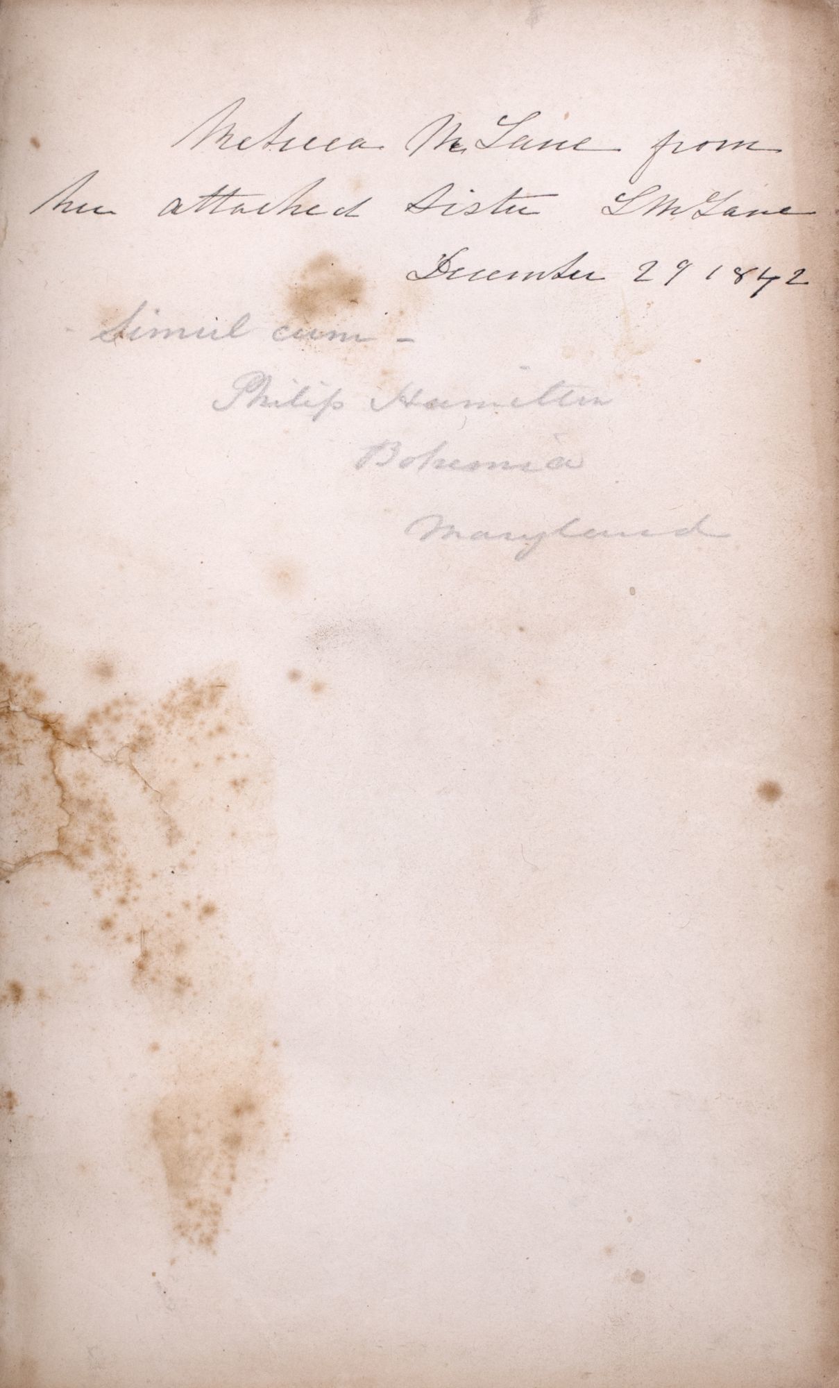 Philadelphia: E. L. Carey and A. Hart, 1841. Engraved additional title. 520, 144pp. 12mo. Contemporary morocco gilt. Repairs to front joint. Provenance: Rebecca Hamilton (inscribed to her by her sister-in-law L. McClane on the date of her wedding to Philip Hamilton, and with an additional inscription by Rebecca: "Simul cum / Philip Hamilton / Bohemia / Maryland. Engraved additional title. 520, 144pp. 12mo. Rebecca McLane married Philip Hamilton, Alexander Hamilton's youngest child, on December 29, 1842.