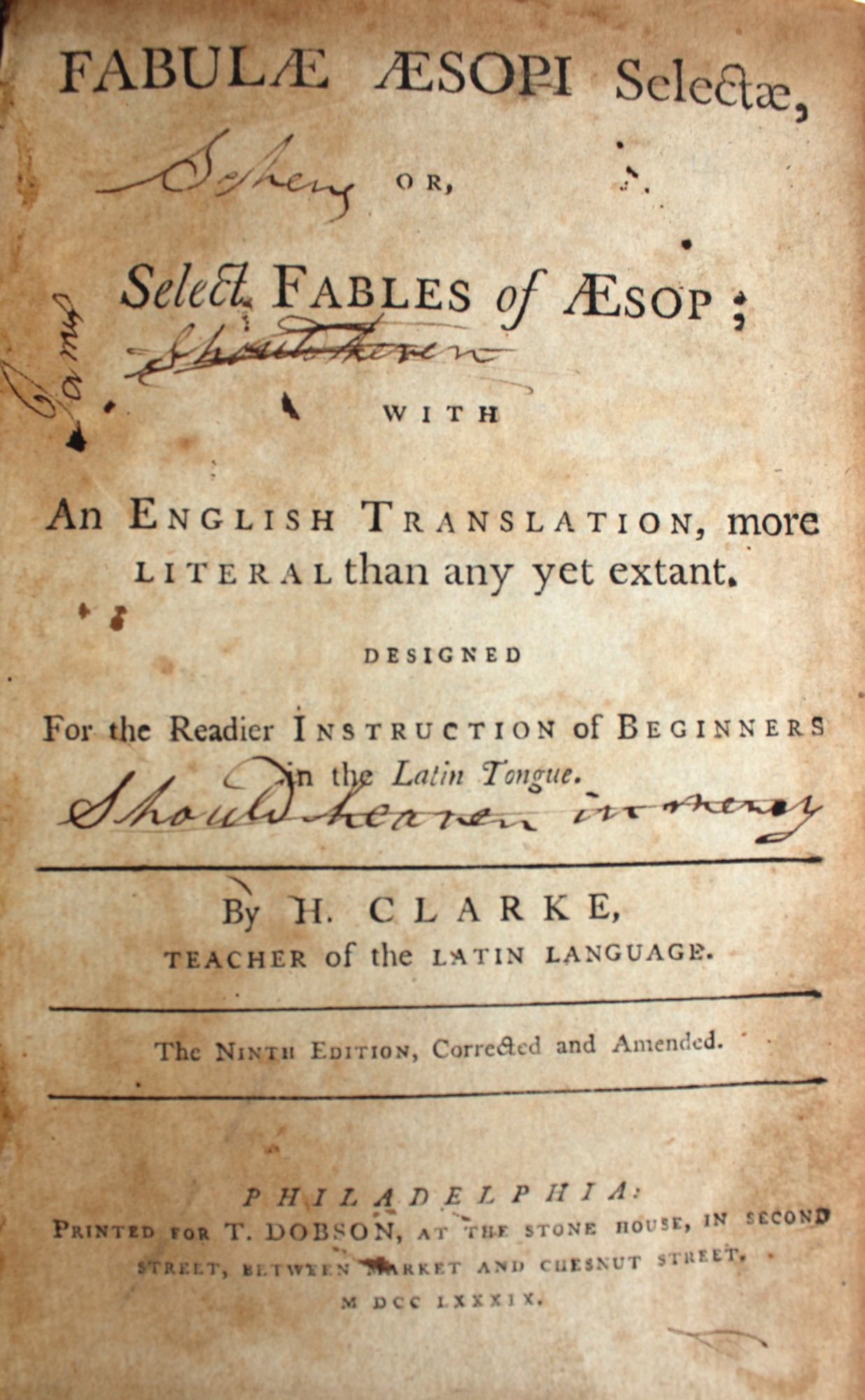 Philadelphia: T. Dobson, 1789. The Ninth Edition, Corrected and Amended. Text in English and Latin. 161, [3]pp. Errors in pagination, as issued. Lacks terminal ad leaf. 12mo. Contemporary calf, some losses to spine, lacks endpapers. Foxing. The Ninth Edition, Corrected and Amended. Text in English and Latin. 161, [3]pp. Errors in pagination, as issued. Lacks terminal ad leaf. 12mo. The first America edition of Aesop was Samuel Croxall's translation published in Philadelphia by Aitken in 1777; the first American editions of Robert Dodsley's translation and that of Robert Burton were published the same year by Robert Bell of Philadelphia. The first American edition of this translation by Clarke was first published in Boston in 1787, with the present 1789 edition being the first Philadelphia edition of that translation. Evans 21631; ESTC W6771