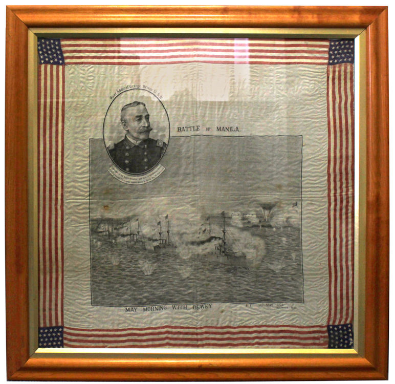 1898. Lithographed view on silk of the Battle of Manila Bay with a large oval portrait of Commodore George Dewey at the upper left, within a hand-drawn American flag border stitched to the view. 21-1/2 x 21-1/2 inches. Framed and glazed. Lithographed view on silk of the Battle of Manila Bay with a large oval portrait of Commodore George Dewey at the upper left, within a hand-drawn American flag border stitched to the view. 21-1/2 x 21-1/2 inches. The first major engagement of the Spanish–American War, the battle was one of the most decisive naval battles in history and marked the end of the Spanish colonial period in Philippine history. On April 27, 1898, Dewey sailed from China aboard USS Olympia with orders to attack the Spanish at Manila Bay. He stopped at the mouth of the bay late the night of April 30, and the following morning he gave the order to attack at first light, saying the now famous words "You may fire when you are ready, Gridley." Dewey defeated the Spanish in a battle lasting just six hours. The Asiatic Squadron sank or captured the entire Spanish Pacific Squadron under Admiral Patricio Montojo y Pasarón and silenced the shore batteries at Manila, with the loss of only one life on the American side.