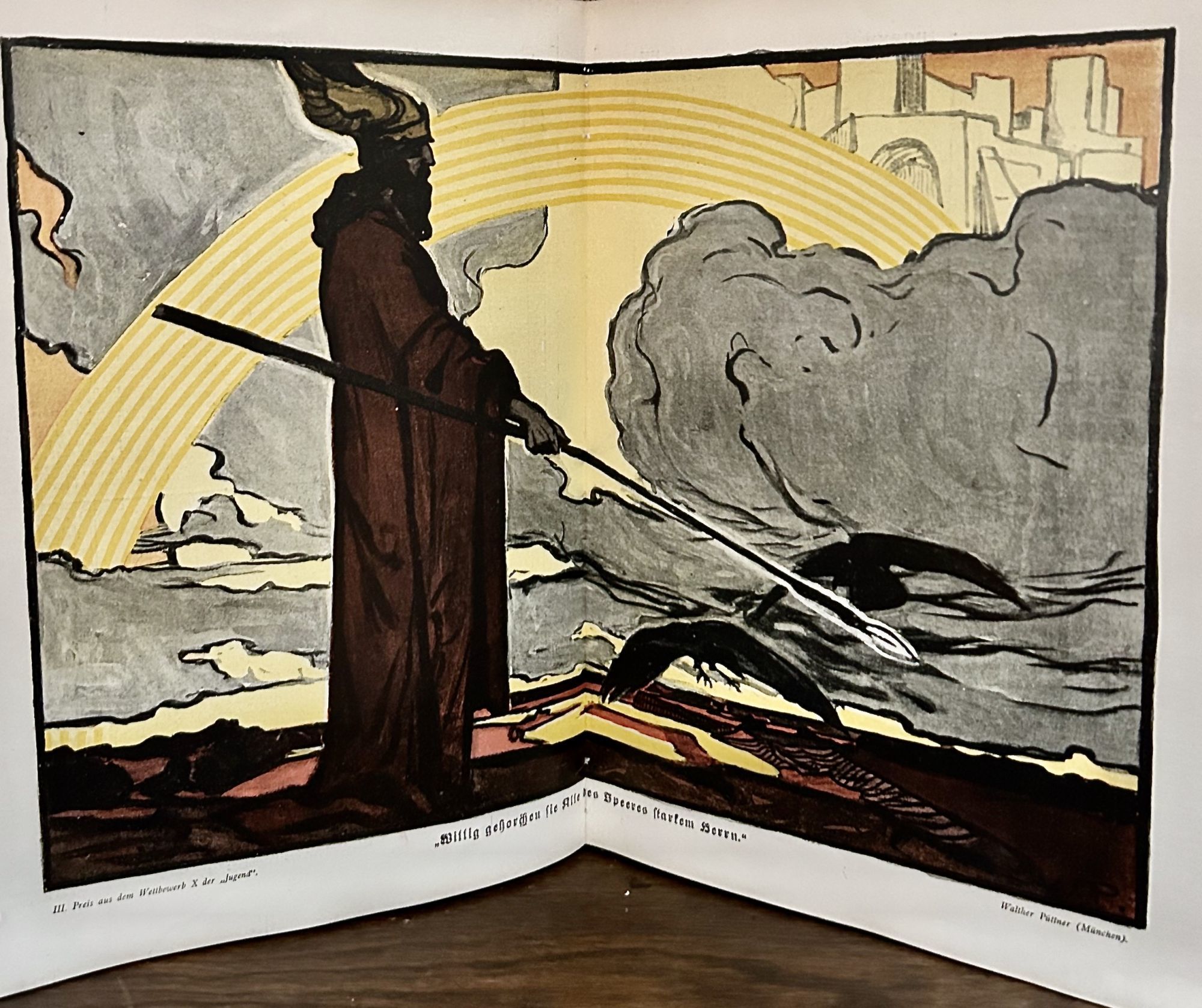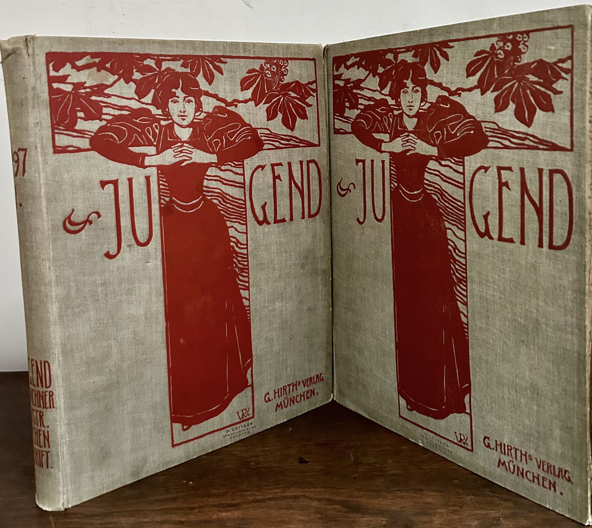 Munich & Leipzig: G. Hirth's Kunstverlag, 1897. First edition. Hardcover. Orig. gray pictorial cloth covers Very good. 2 Vols. 872 pages. 30 x 23 cm. Jugend (German: "Youth") (1896–1940) was an influential German arts magazine. Founded in Munich by Georg Hirth the weekly was originally intended to showcase German Arts and Crafts, but became famous for showcasing the German version of Art Nouveau. It was famous for its shockingly brilliant covers and for its avant-garde influence on German arts and culture, ultimately launching the eponymous Jugendstil ("Youth Style") movement in Munich. In addition to modern illustrations and the ornamentation of Art Nouveau, Jugend featured impressionist and expressionist art, as well. Covers are color lithographs, a cornucopia of interior designs with a host of black and white and color lithographs within the text. Index in Vol. II. Small stamps of H. Leitner, Hamburg front free endpapers and title page. Also, miniscule H. Leitner stamps at lower front covers, practically indiscernible. slight crincle at backstrip heads.